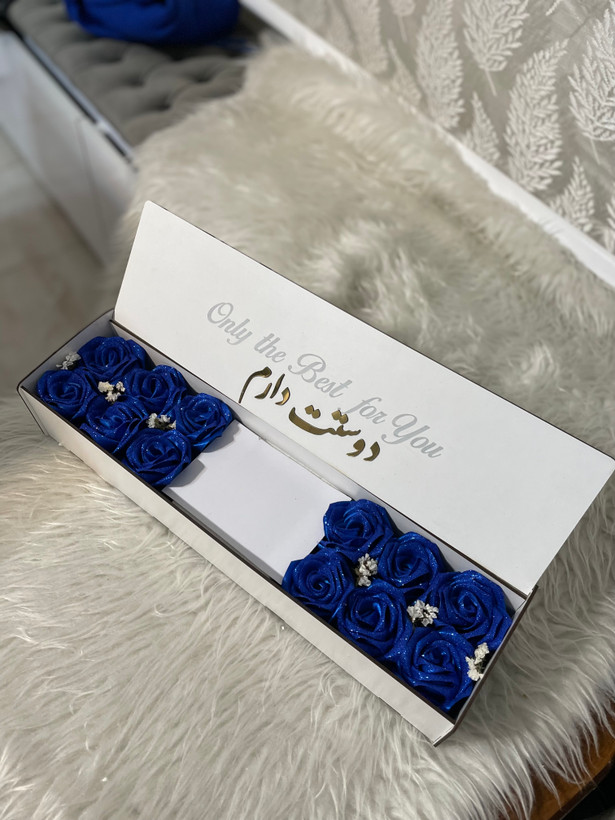 ترکیبی از گلهای رز آبی کاربنی ربانی با تزئینات گل عروس طبیعی درون یک باکس زیبا