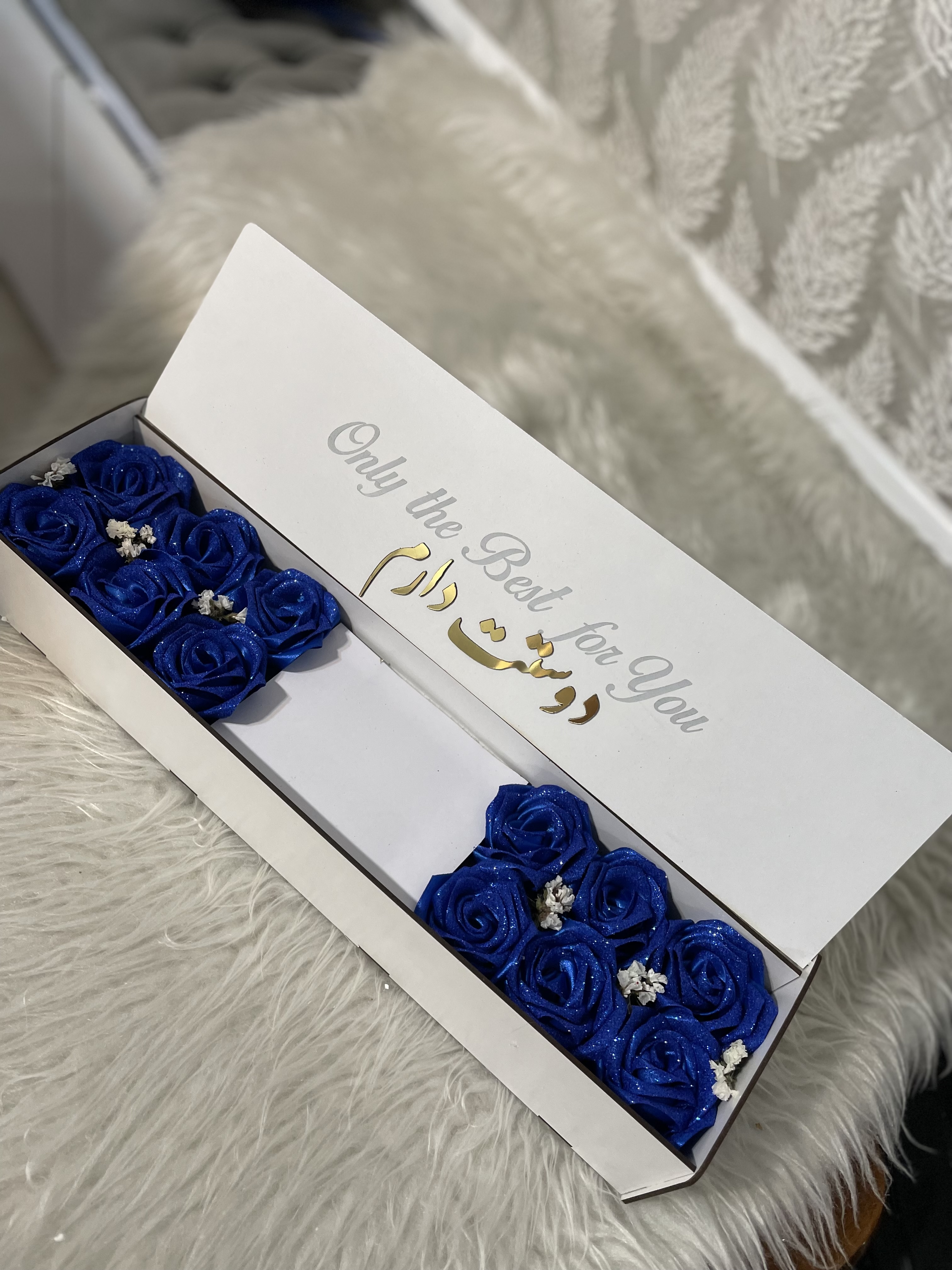 ترکیبی از گلهای رز آبی کاربنی ربانی با تزئینات گل عروس طبیعی درون یک باکس زیبا