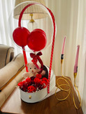 باکس هدیه نوزادی گل ربانی و عروسک قرمز