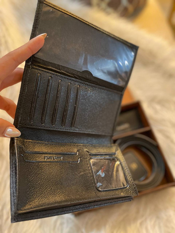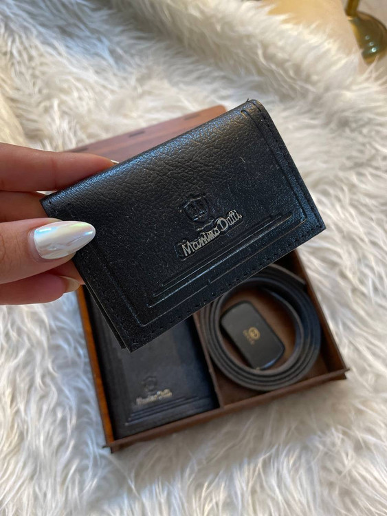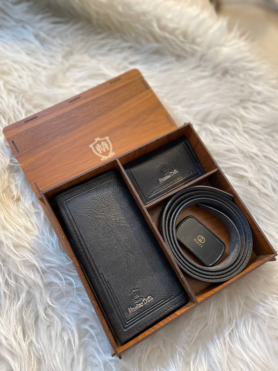 ست کیف و کمربند و جاکارتی چرم مصنوعی باکس هدیه چوبی