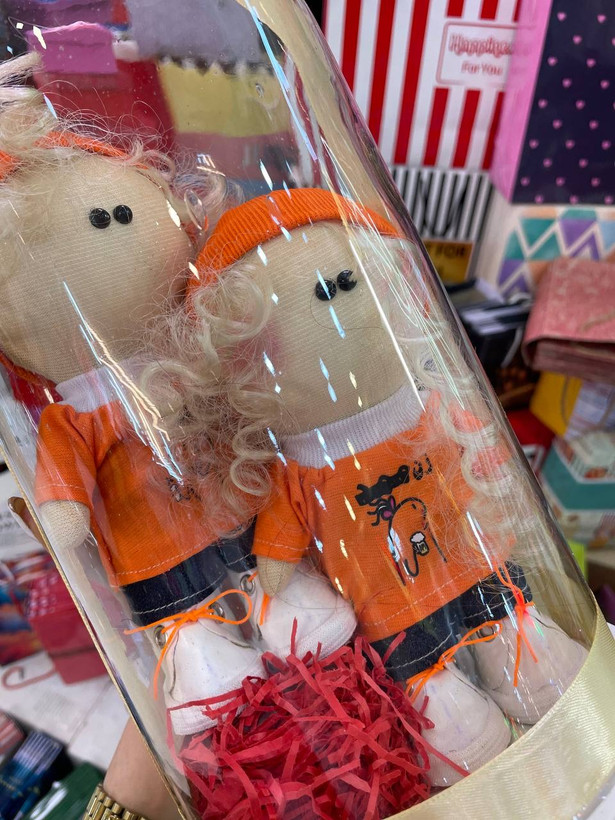 عروسکهای دستساز جفتی داخل حباب شیشهای، با طراحی فانتزی و لباسهای ست نارنجی ❤️