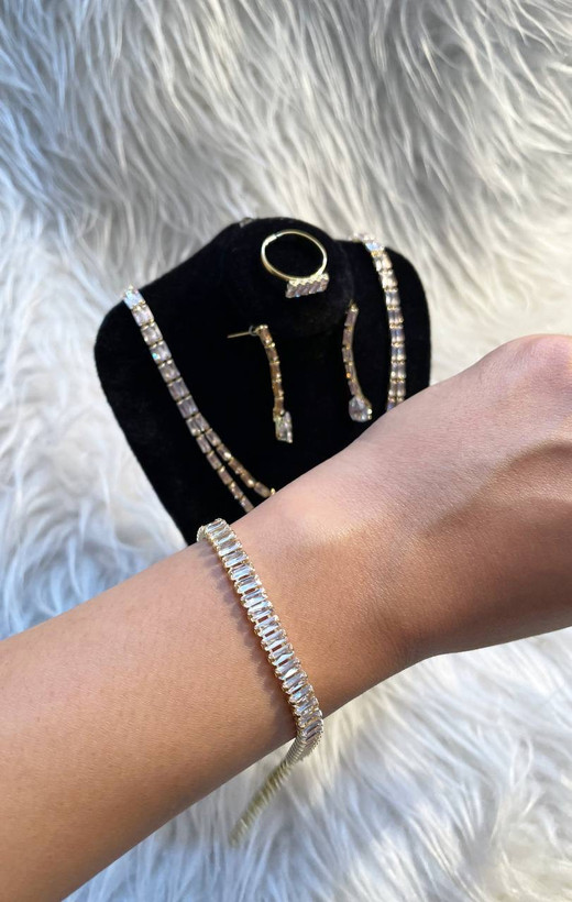 این سرویس مجلسی شامل گردنبند دو ردیفه، گوشواره، انگشتر و دستبند) با نگینهای درخشان و طراحی ظریف میباشد. ترکیب رنگ طلایی با نگینهای براق، زیبایی و جذابیت بینظیری به شما میبخشد و انتخابی فوقالعاده برای عروسیها، مجالس و مهمانیهای رسمی است.