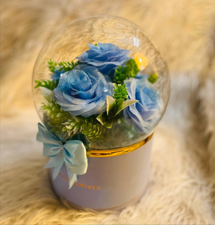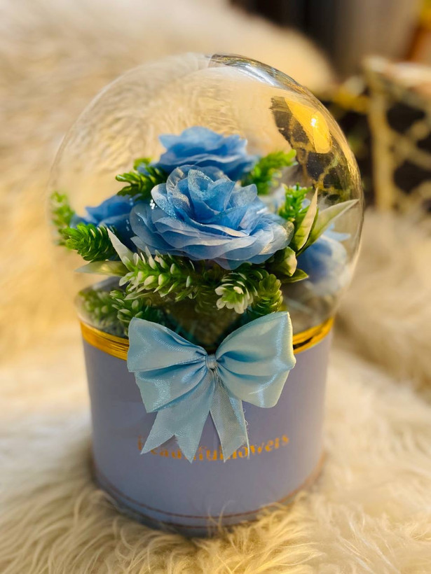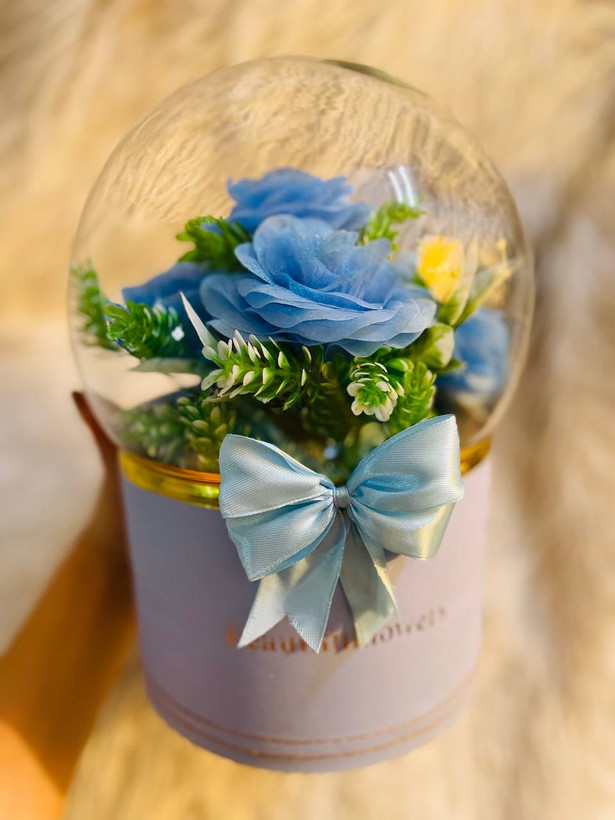 باکس گل مصنوعی ماندگار رنگ آبی، قرار گرفته داخل حباب شیشهای شیک و تزیین شده با روبان ❤️