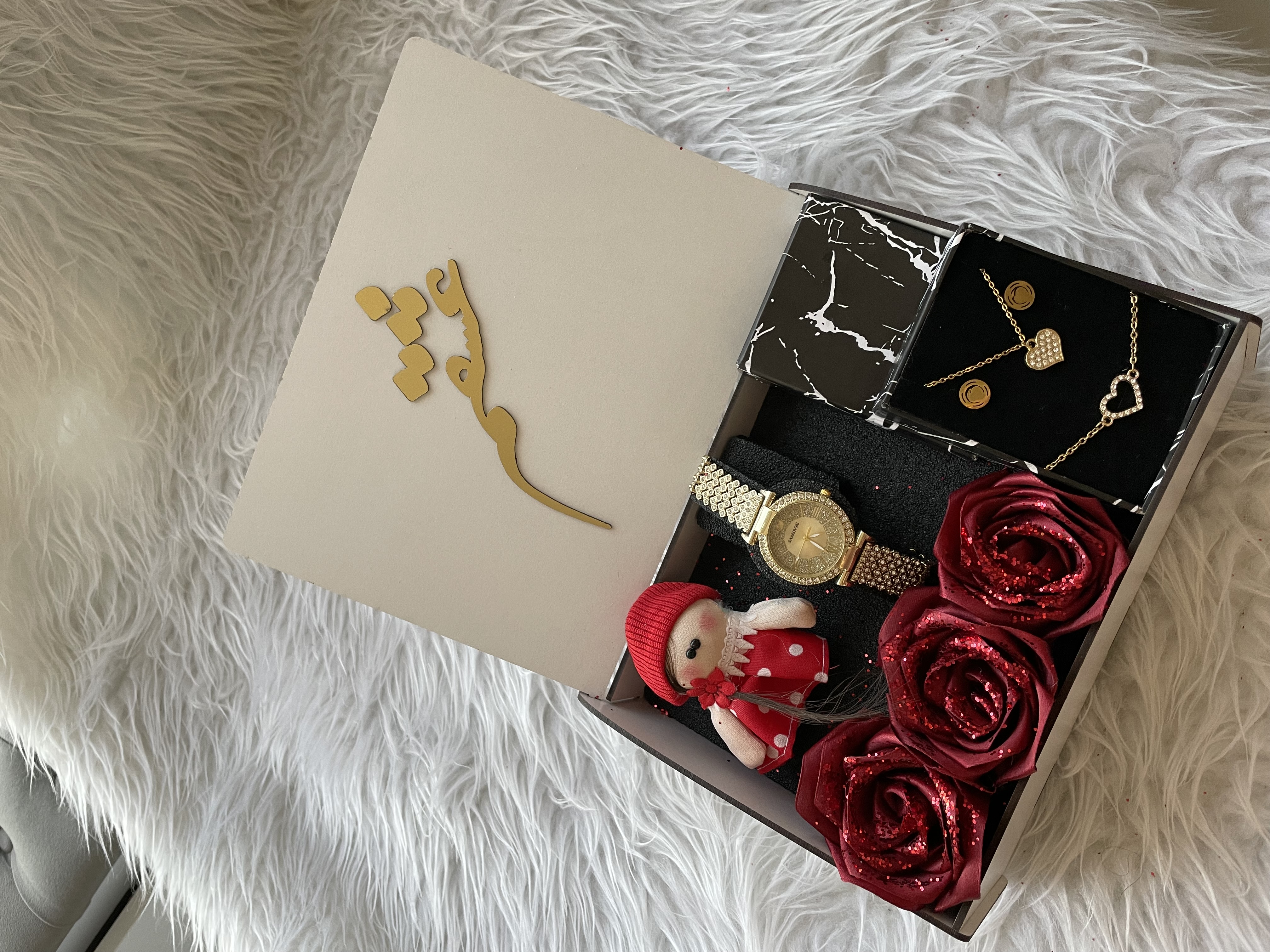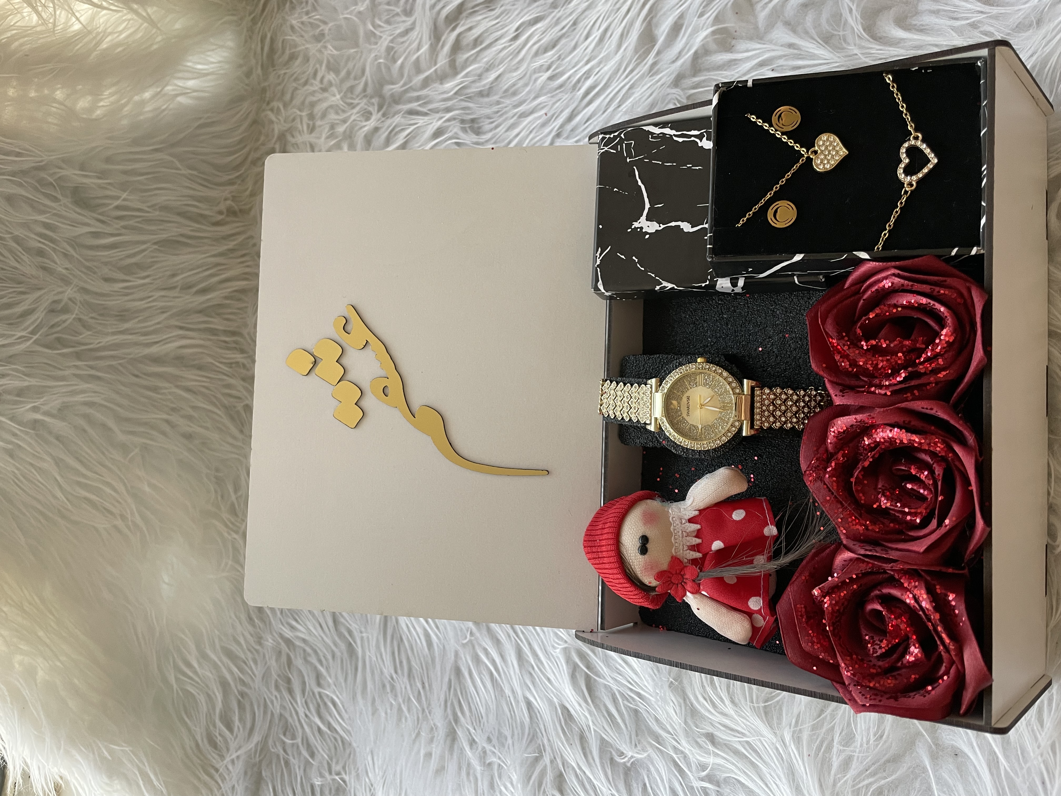 باکس کادویی زنانه لاکچری | ست کامل اکسسوری با ساعت، عروسک و گل رز | انتخابی شیک برای روز زن و روز مادر+ ارسال رایگان