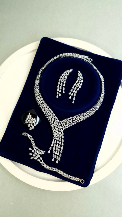 این سرویس جواهری شیک و خاص از جنس تیتانیوم با آبکاری باکیفیت ساخته شده و درخشش فوقالعادهای دارد. طراحی ظریف و نگینهای درخشان، جلوهای لوکس به استایل شما میبخشد و مناسب مجالس، عروسی و جشنهاست.