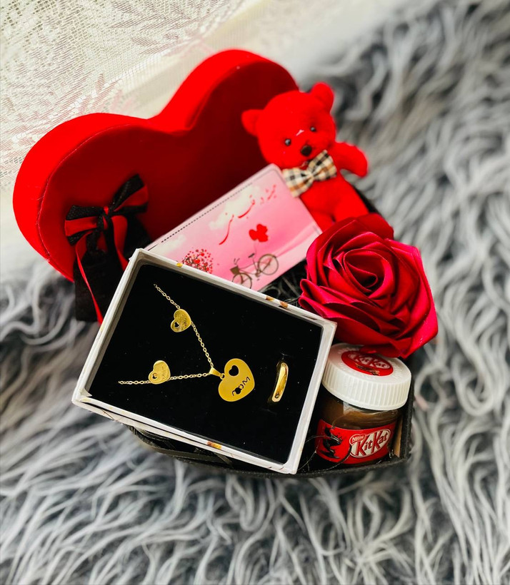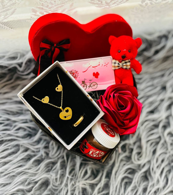 این باکس قلبیشکل با ترکیب گردنبند و انگشتر استیل زیبا و ظریف، خرس قرمز بامزه، رز ربانی و نوتلا ، یه سورپرایز شیرین و خاص برای هر مناسبتیه 🎀