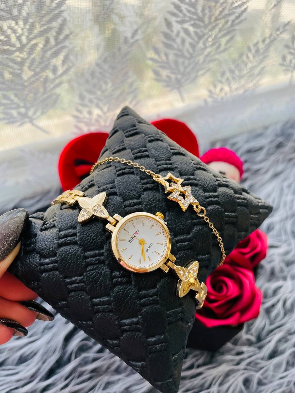ترکیب ساعت طلایی ظریف با دستبند ست، در کنار رزهای ربانی ساتنی قرمز در باکس قلبیشکل قرمز، جلوهای لوکس و خاص به هدیهت میده ❤️