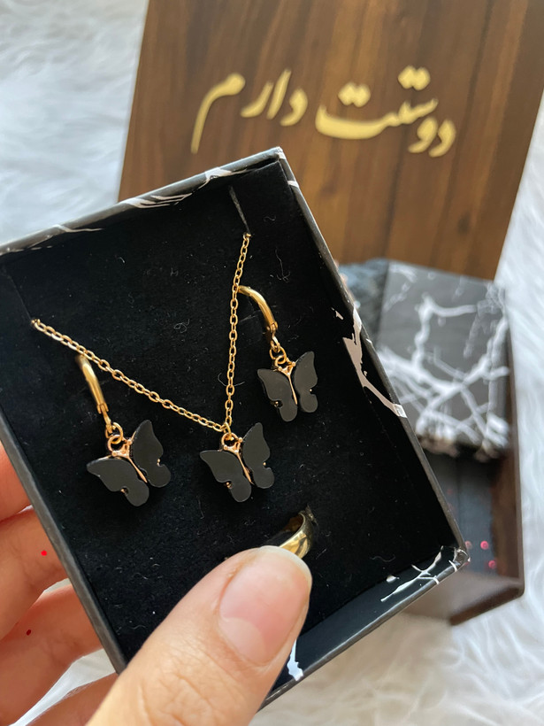 ✅ نیم ست پروانه مشکی پینترستی شیک و زیبا(گردنبند،گوشواره،حلقه و دستبند)