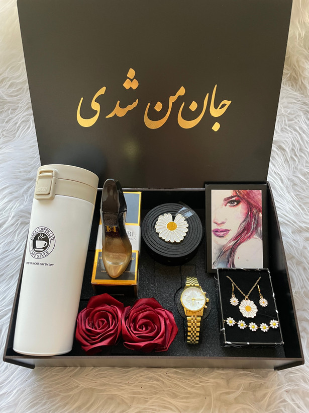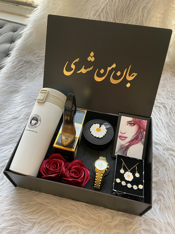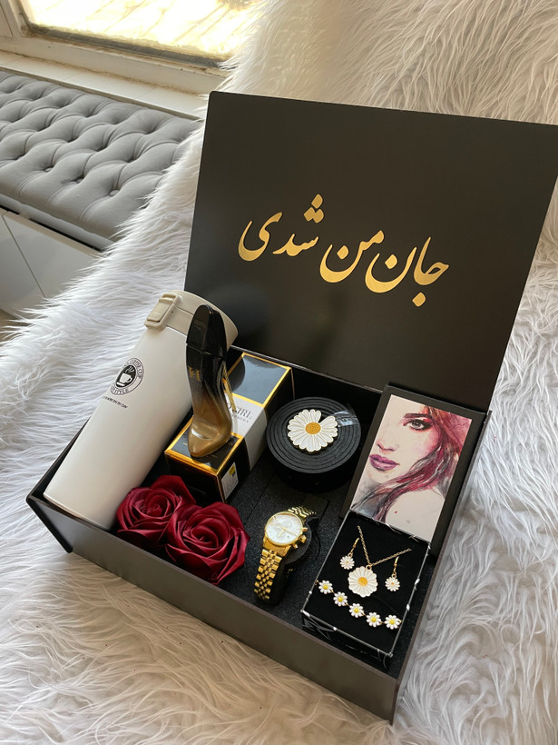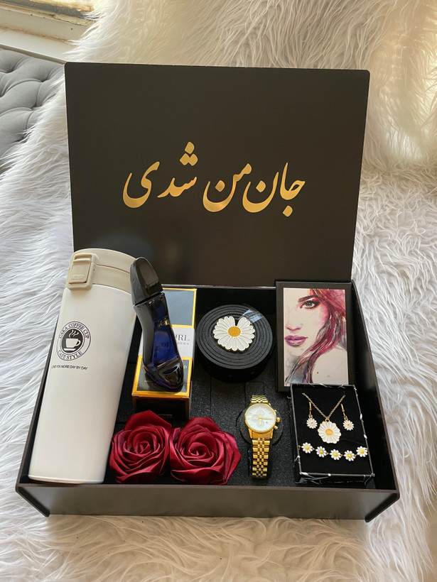 (ارسال رایگان) باکس هدیه زنانه و دخترانه لاکچری/تراول ماگ|ساعت|ست بابونه ترند|ادکلن|کمربند|باکس چوبی با متن انتخابی