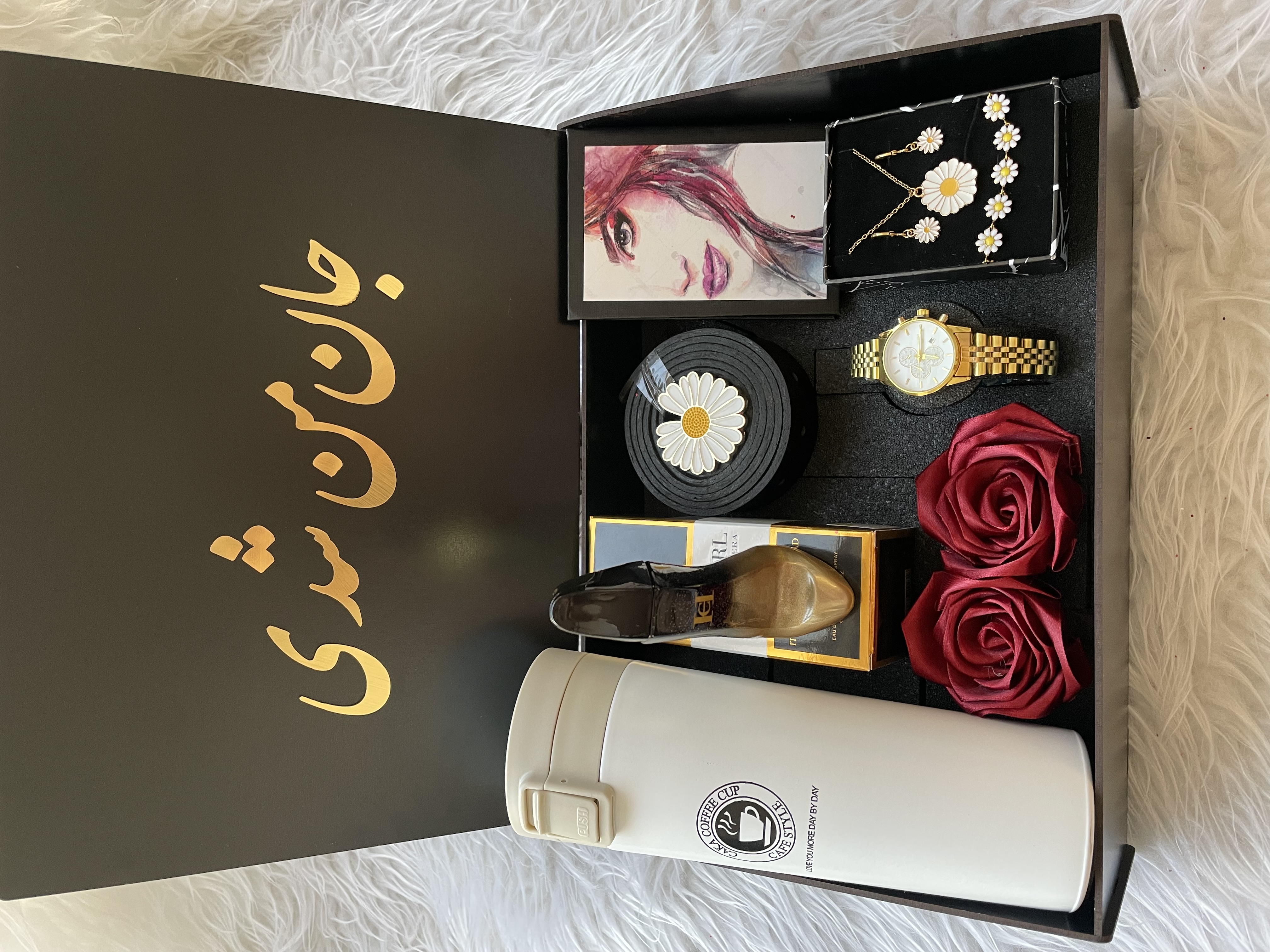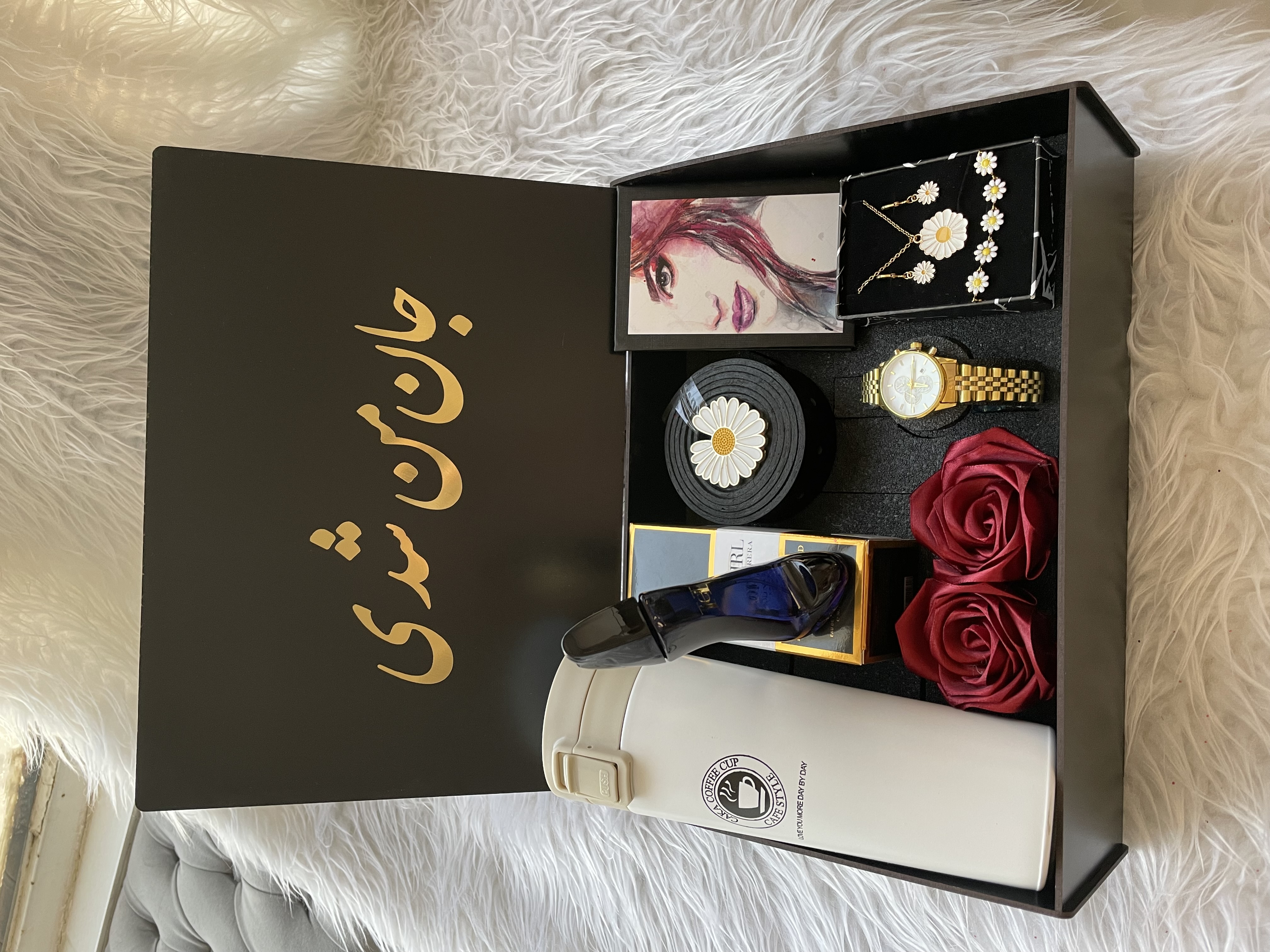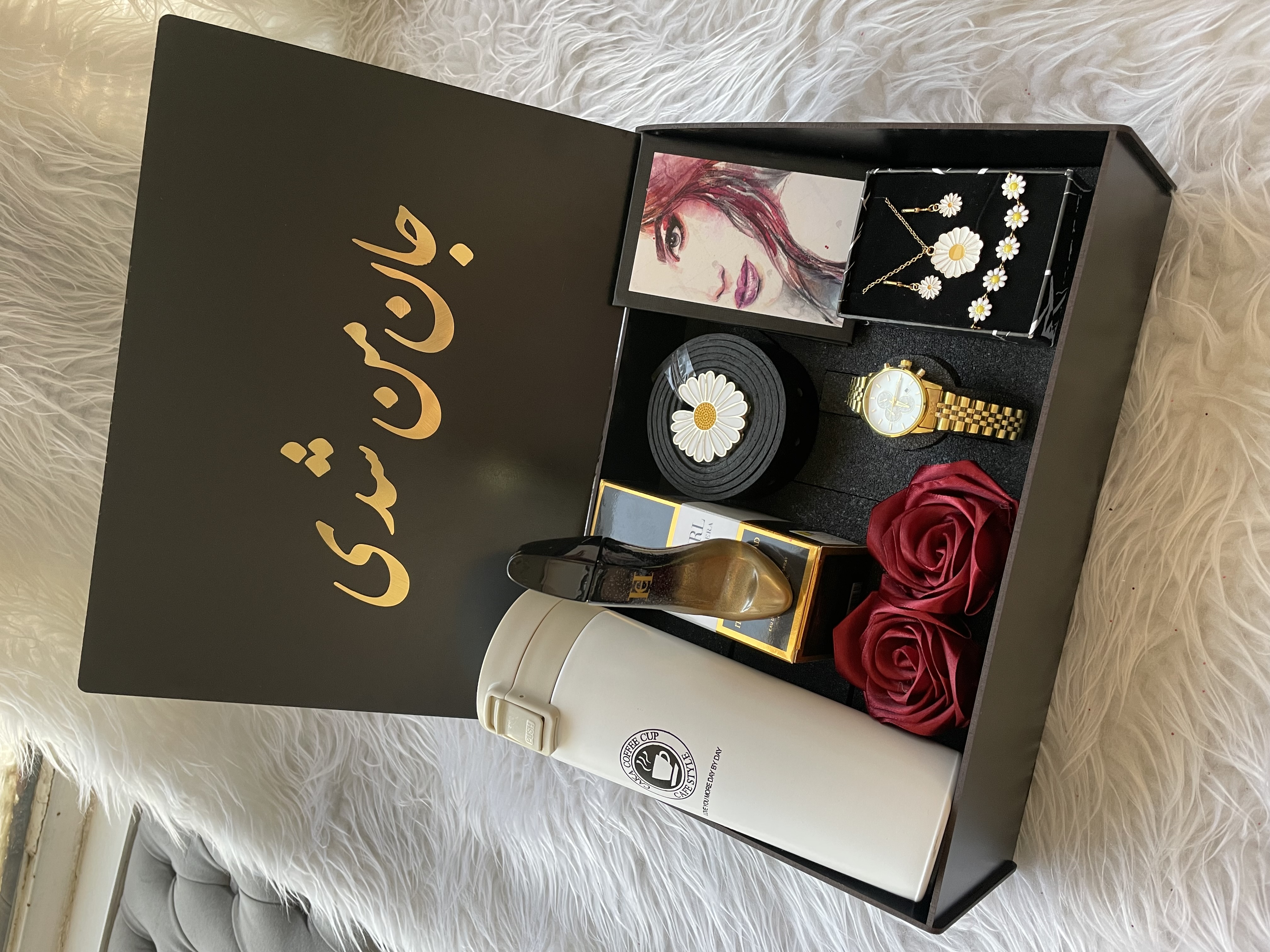 (ارسال رایگان) باکس هدیه زنانه و دخترانه لاکچری/تراول ماگ|ساعت|ست بابونه ترند|ادکلن|کمربند|باکس چوبی با متن انتخابی