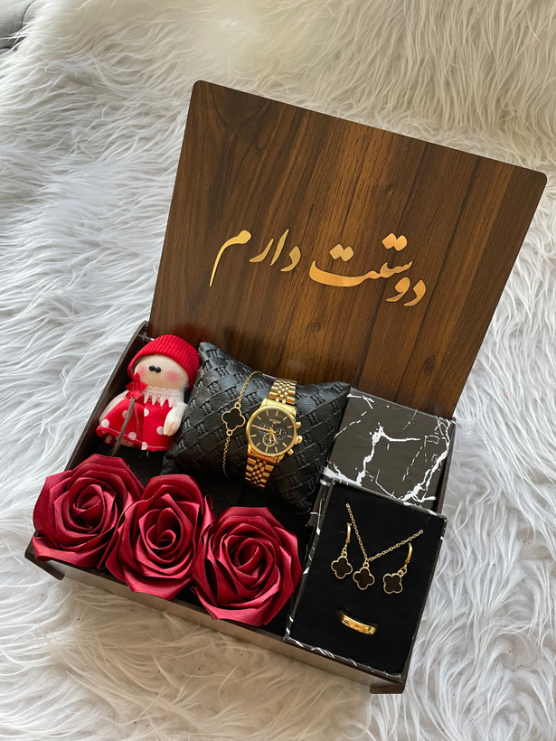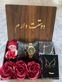 باکس هدیه ویژه روز زن | ست اکسسوری شیک با ساعت، گردنبند، عروسک و رز ربانی| مناسب هدیه مناسبتی + ارسال رایگان