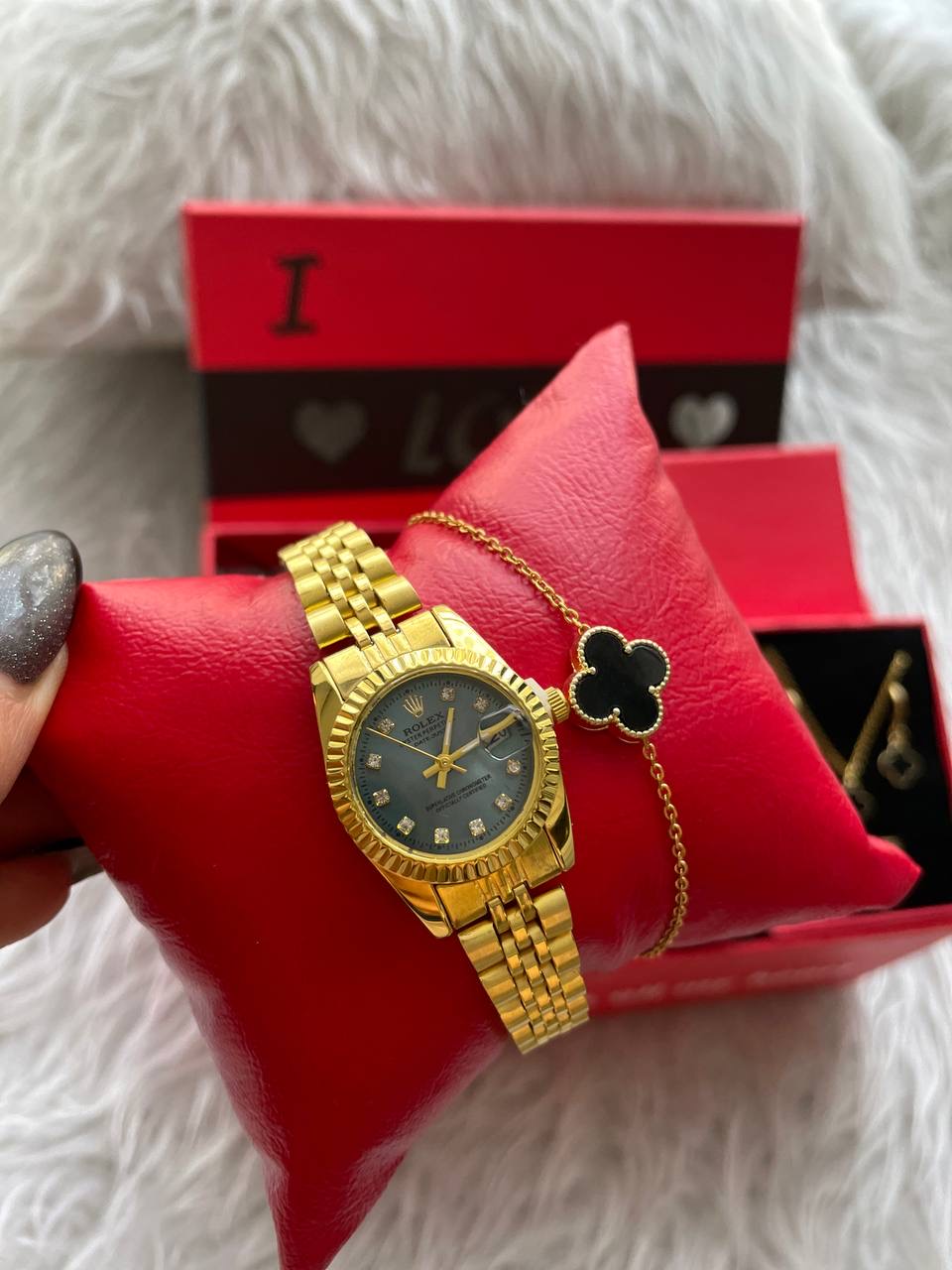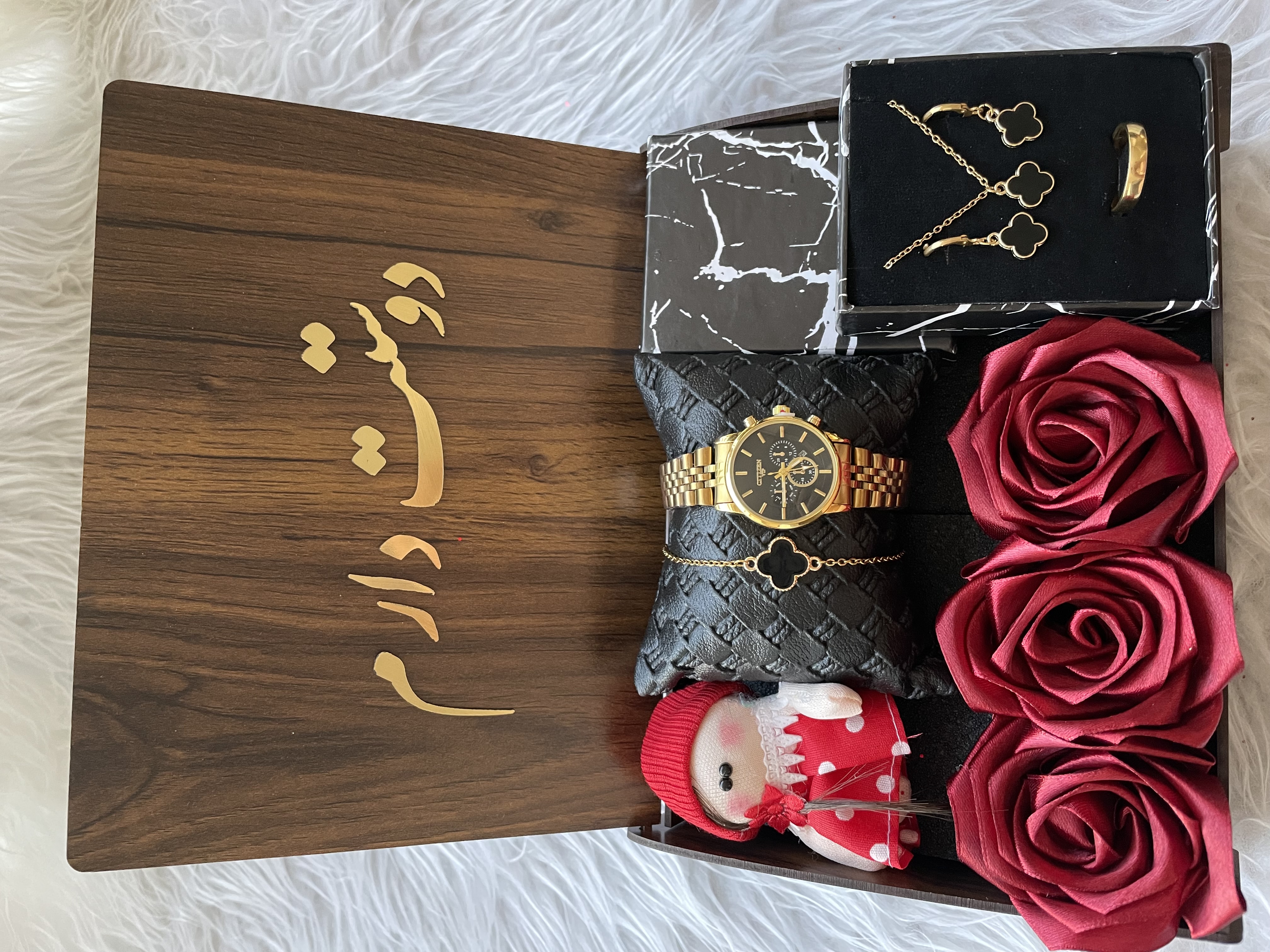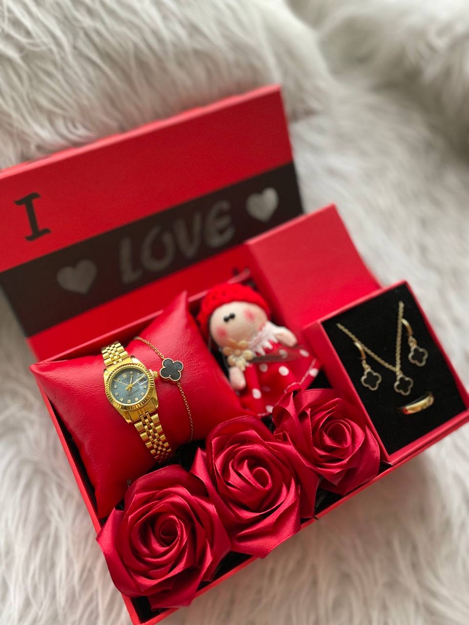 باکس هدیه ویژه روز زن | ست اکسسوری شیک با ساعت، گردنبند، عروسک و رز ربانی| مناسب هدیه مناسبتی + ارسال رایگان