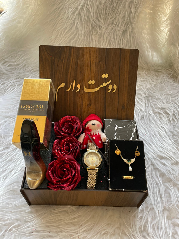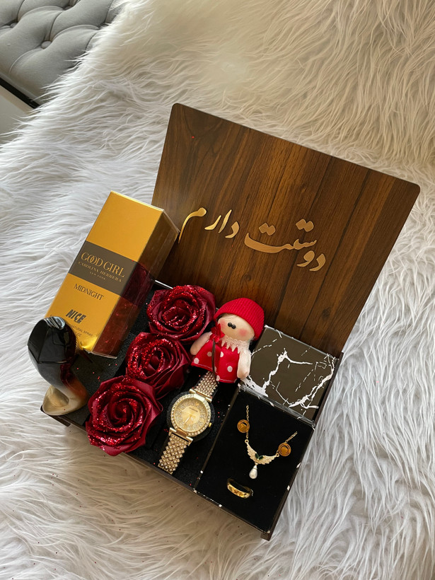 (ارسال رایگان) باکس هدیه زنانه و دخترانه شیک و خاص/ساعت/ادکلن/باکس چوبی با متن انتخابی