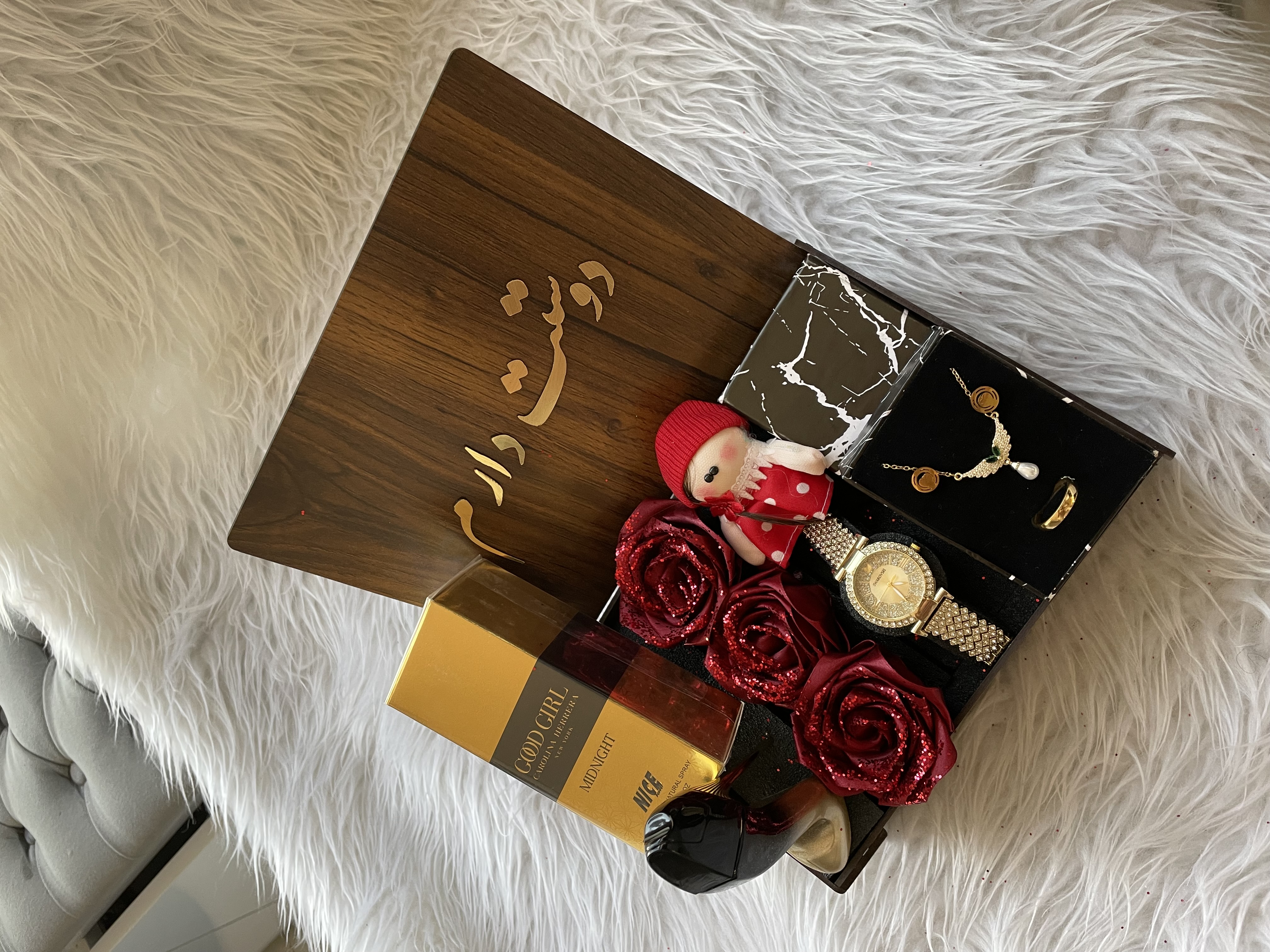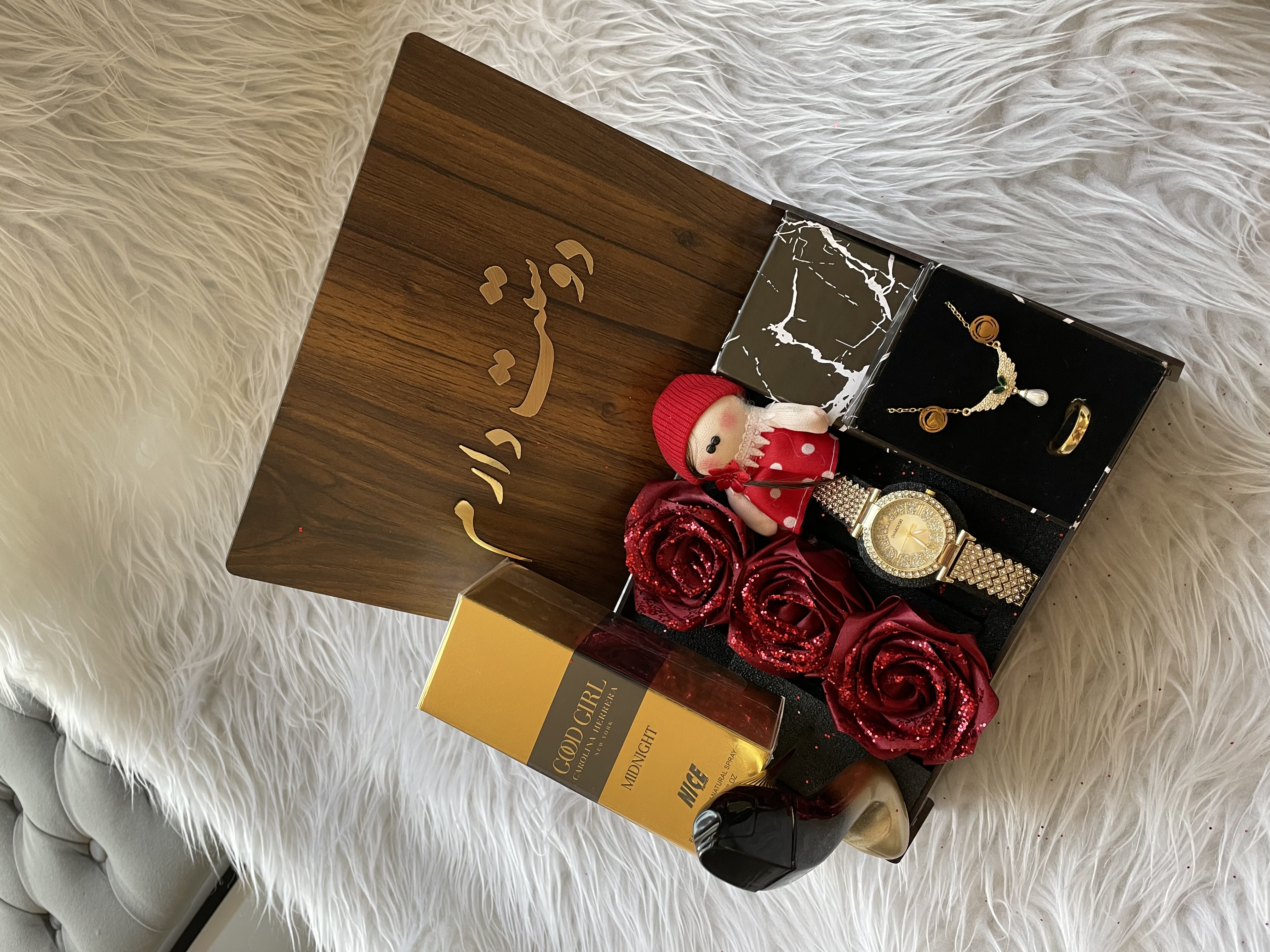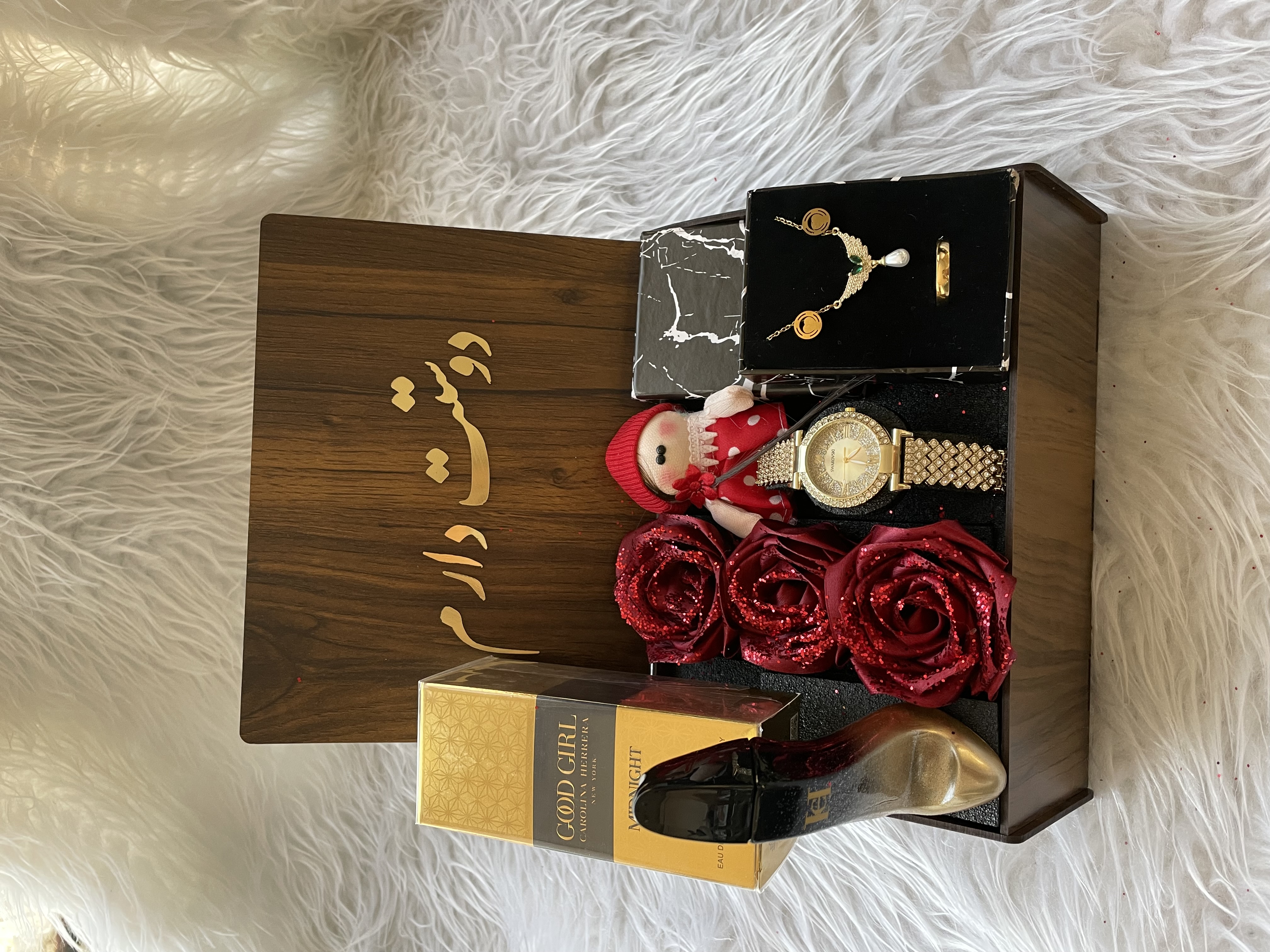 (ارسال رایگان) باکس هدیه زنانه و دخترانه شیک و خاص/ساعت/ادکلن/باکس چوبی با متن انتخابی