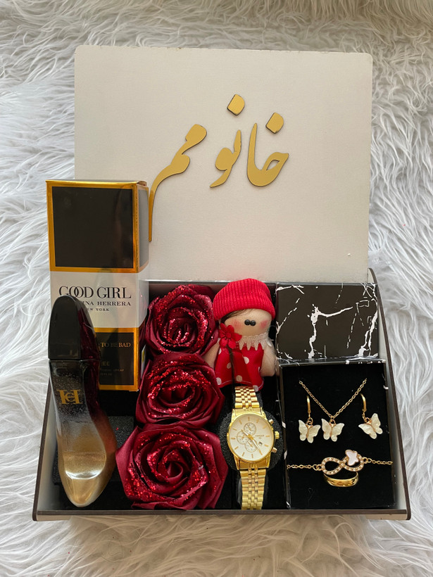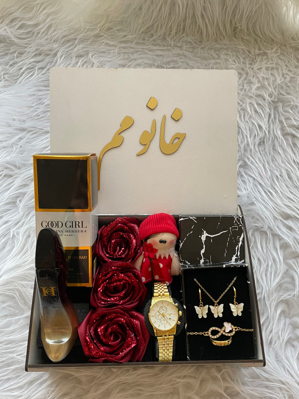(ارسال رایگان) پک هدیه زنانه شیک/باکس چوبی/ساعت/ادکلن/متن انتخابی