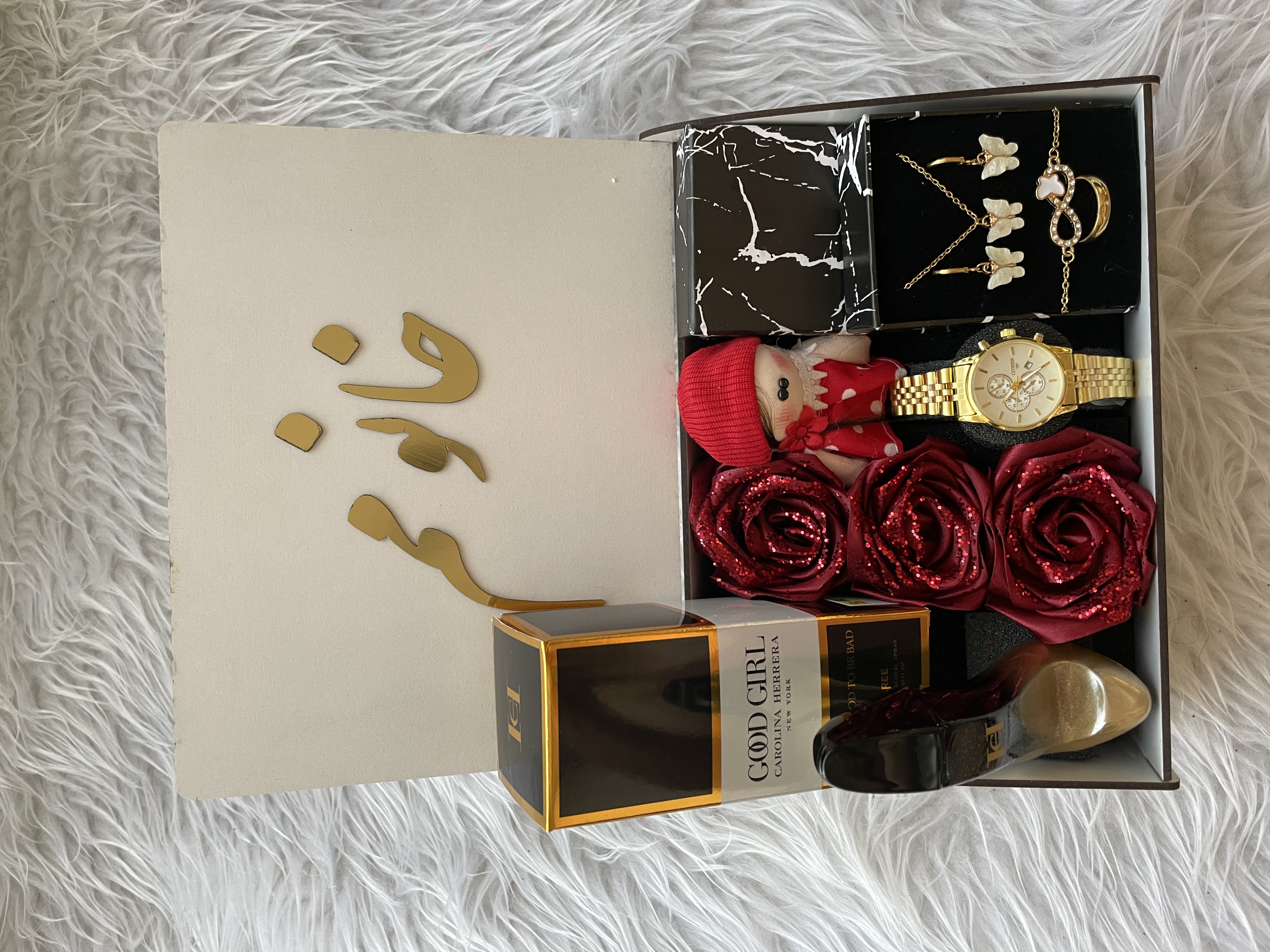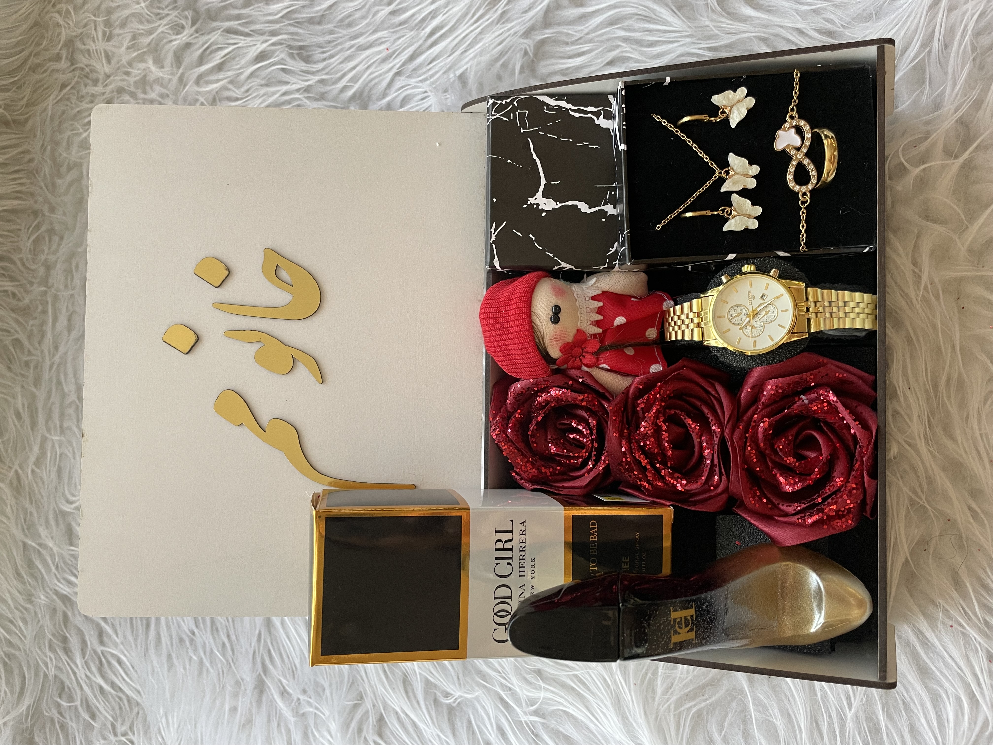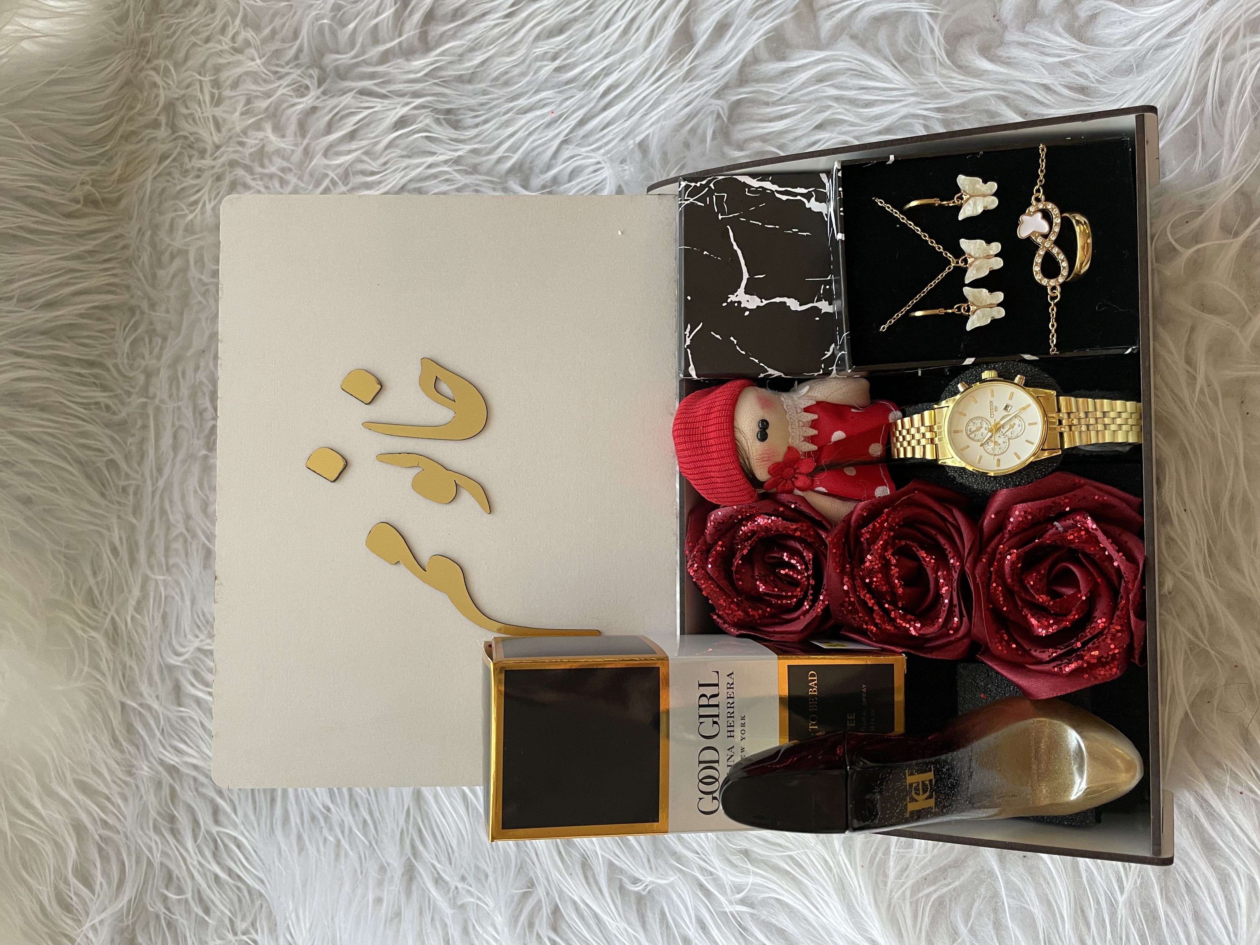 (ارسال رایگان) پک هدیه زنانه شیک/باکس چوبی/ساعت/ادکلن/متن انتخابی