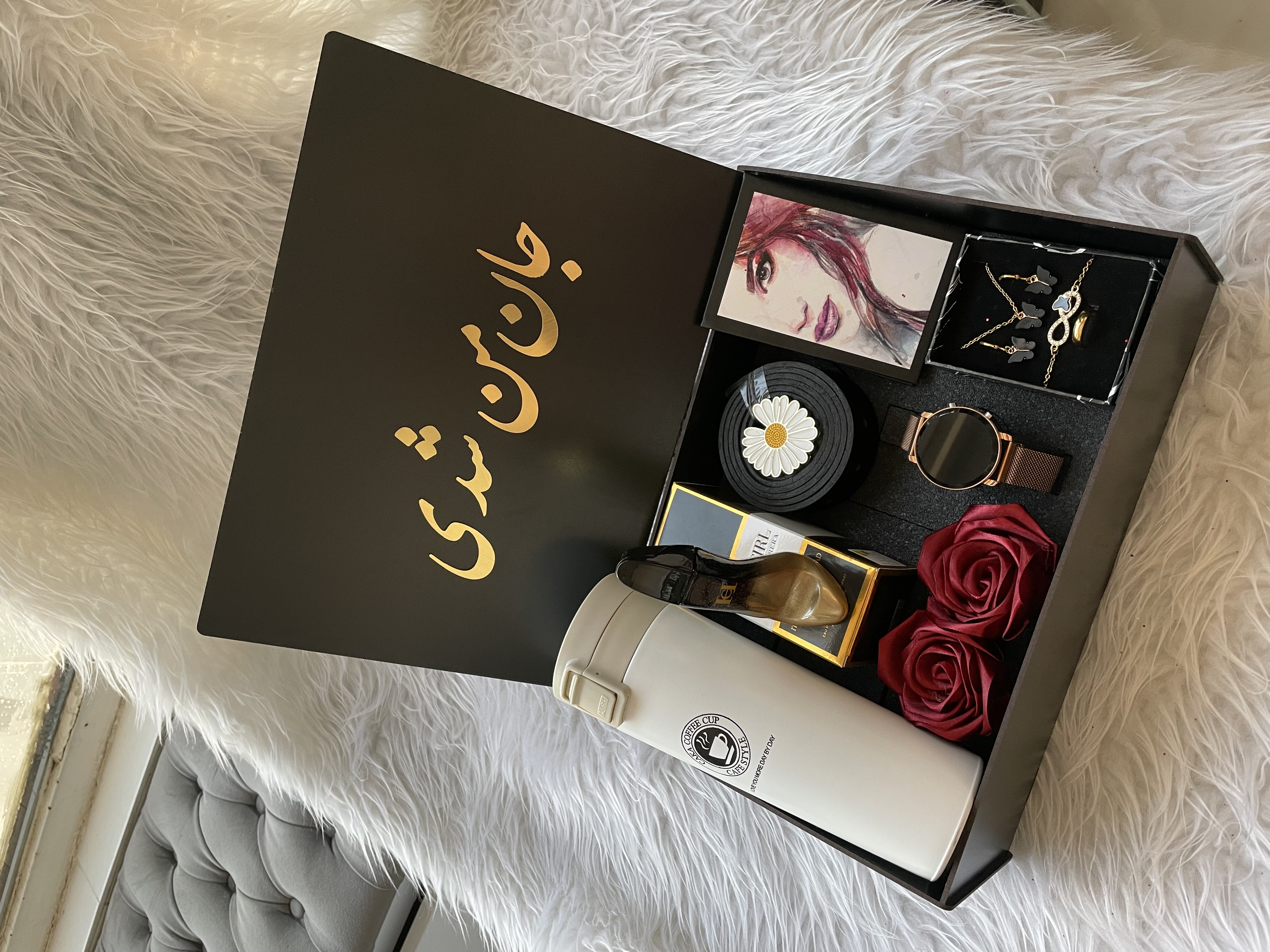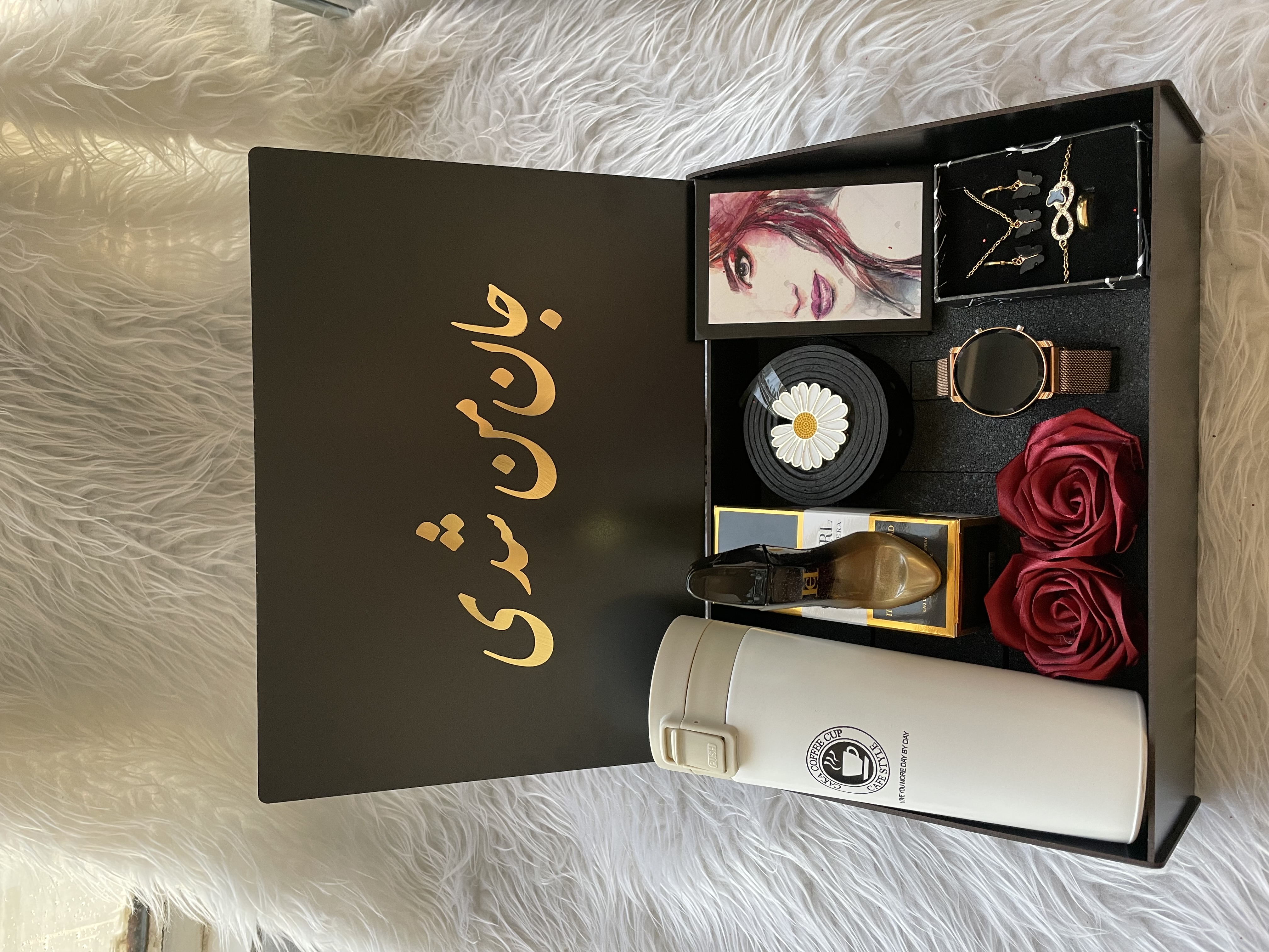 (ارسال رایگان) باکس هدیه زنانه و دخترانه لاکچری/تراول ماگ|ساعت|ست پروانه ای|ادکلن|کمربند|باکس چوبی با متن انتخابی