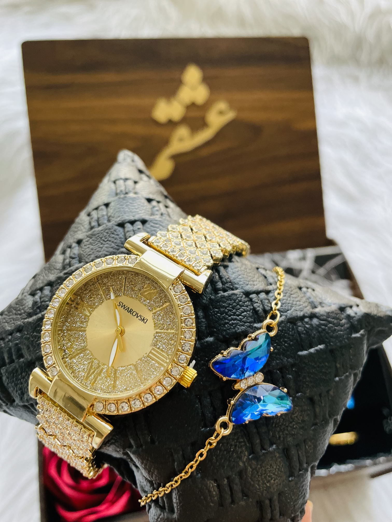 (ارسال رایگان) پک هدیه زنانه و دخترانه ساعت نگینی،نیم ست پروانه کریستالی شیک ولنتاین