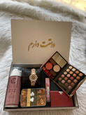 (ارسال رایگان) باکس هدیه زنانه و دخترانه لاکچری/سایه|ساعت |رژلب|اسپری|جاکارتی|باکس چوبی کادو ولنتاین