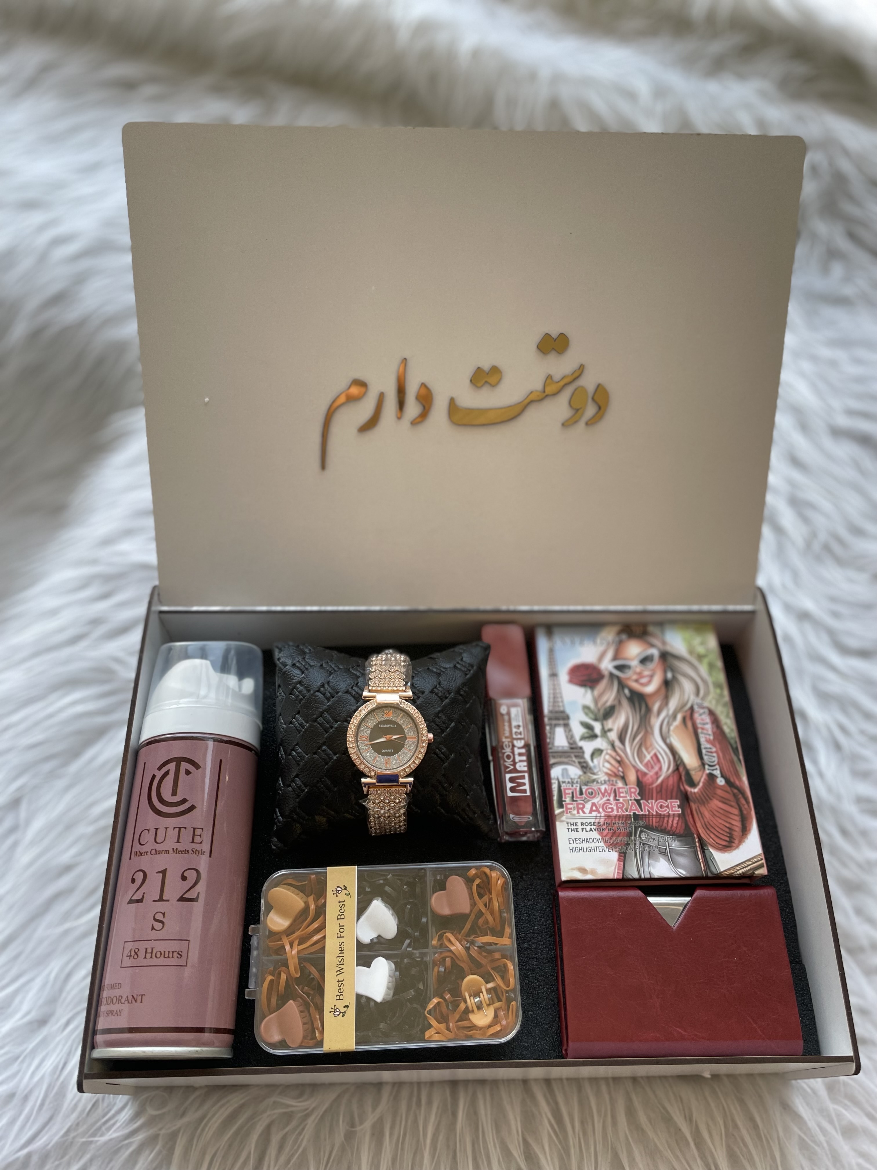(ارسال رایگان) باکس هدیه زنانه و دخترانه لاکچری/سایه|ساعت |رژلب|اسپری|جاکارتی|باکس چوبی کادو ولنتاین