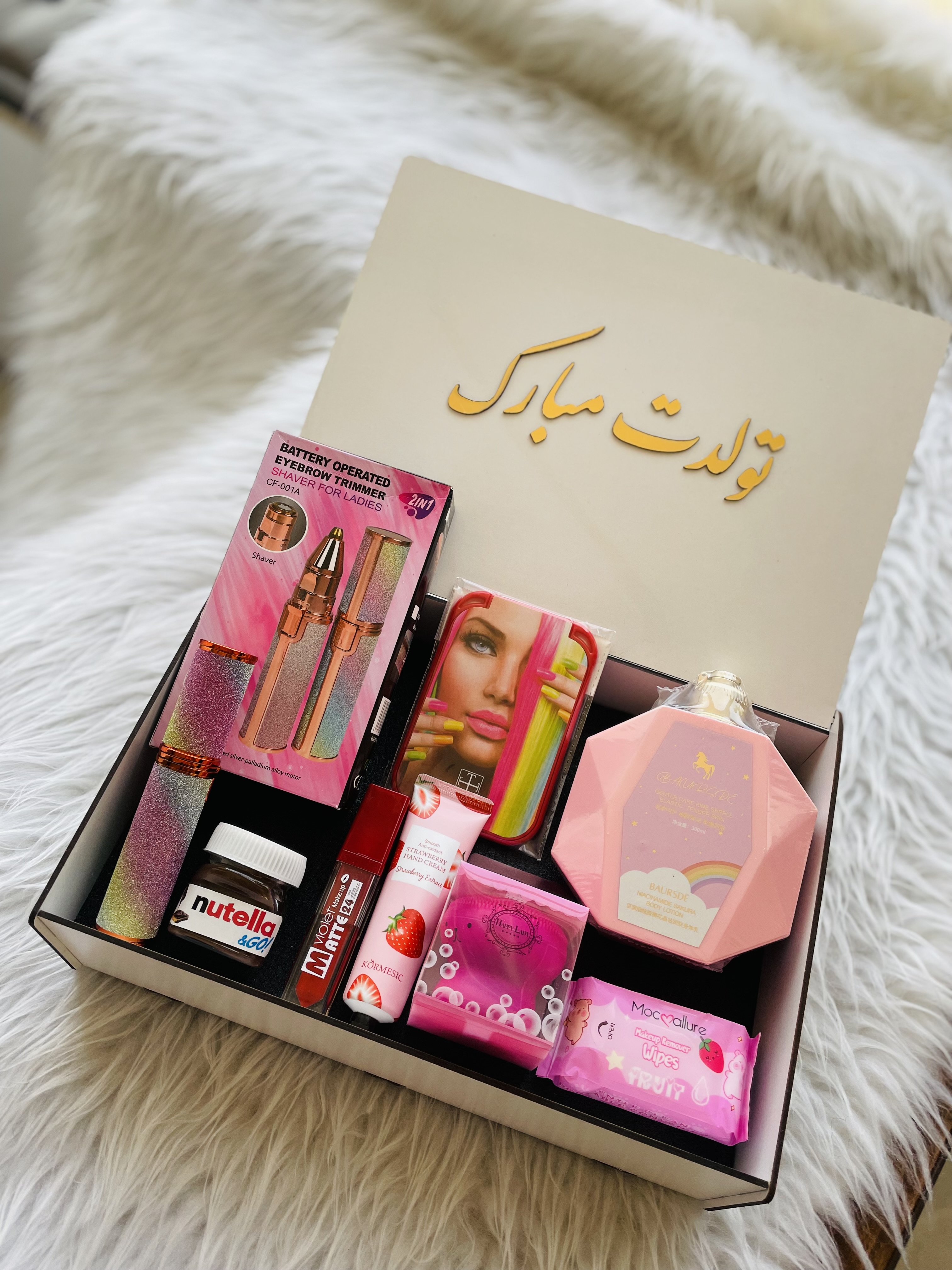 (ارسال رایگان) باکس هدیه زنانه و دخترانه لاکچری/شیور صورت|لوسیون بدن|رژلب|نوتلا|باکس چوبی کادو ولنتاین