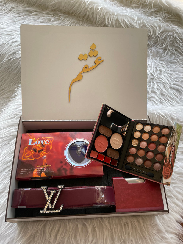 (ارسال رایگان) باکس هدیه زنانه و دخترانه لاکچری/مروارید عشق|پالت سایه |کمربند|جاکارتی|باکس چوبی کادو ولنتاین ۳