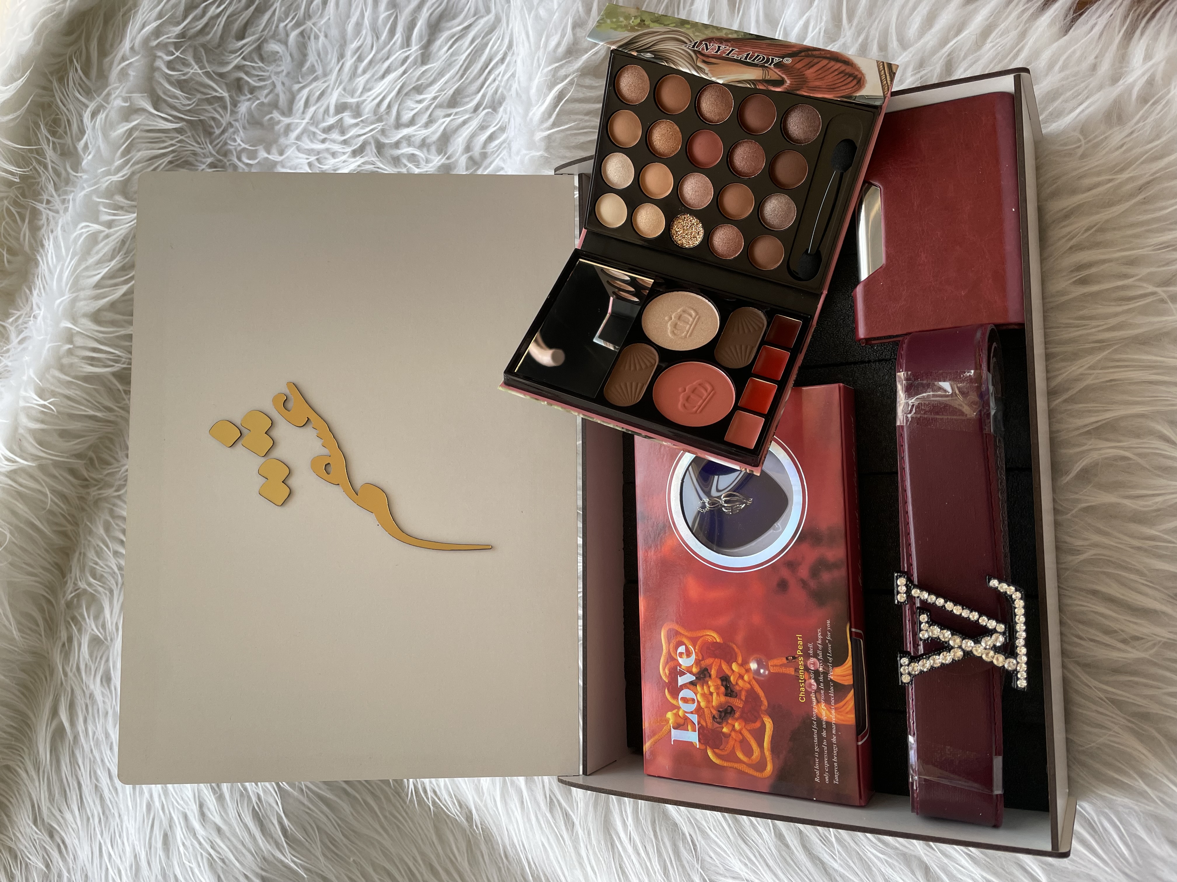 (ارسال رایگان) باکس هدیه زنانه و دخترانه لاکچری/مروارید عشق|پالت سایه |کمربند|جاکارتی|باکس چوبی کادو ولنتاین ۳
