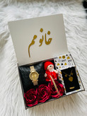 باکس هدیه چوبی ویژه ولنتاین زنانه و دخترانه کادو شیک ساعت نگینی و نیم ست اسپرت و مجلسی ۸