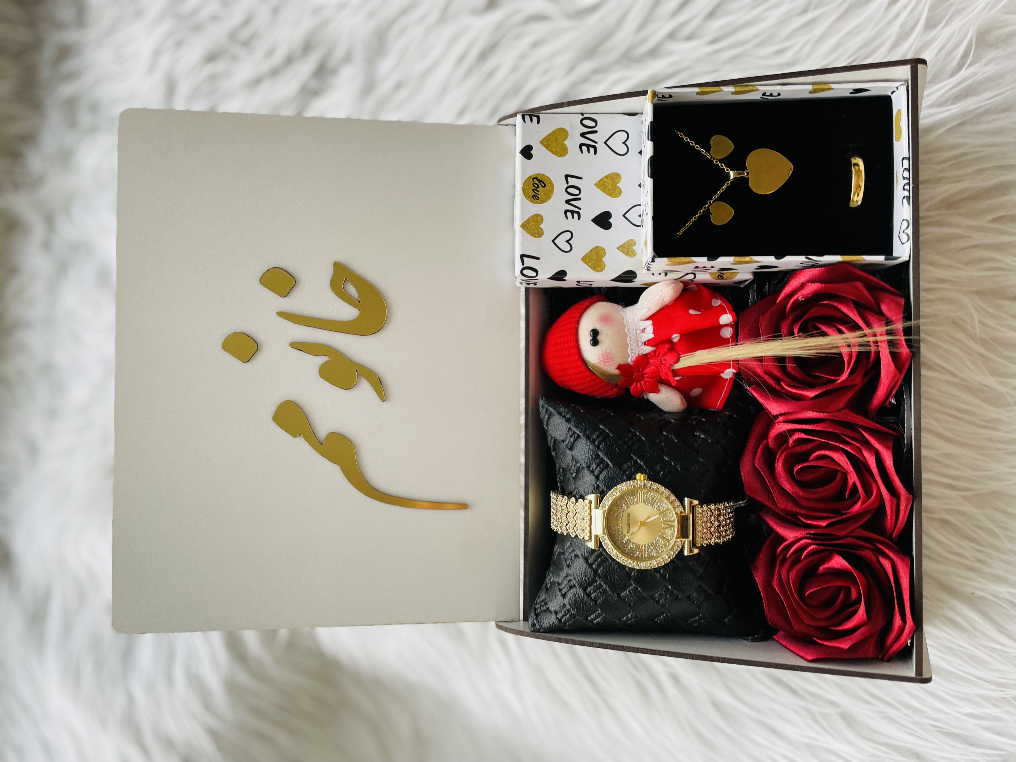 باکس هدیه چوبی ویژه ولنتاین زنانه و دخترانه کادو شیک ساعت نگینی و نیم ست اسپرت و مجلسی ۸