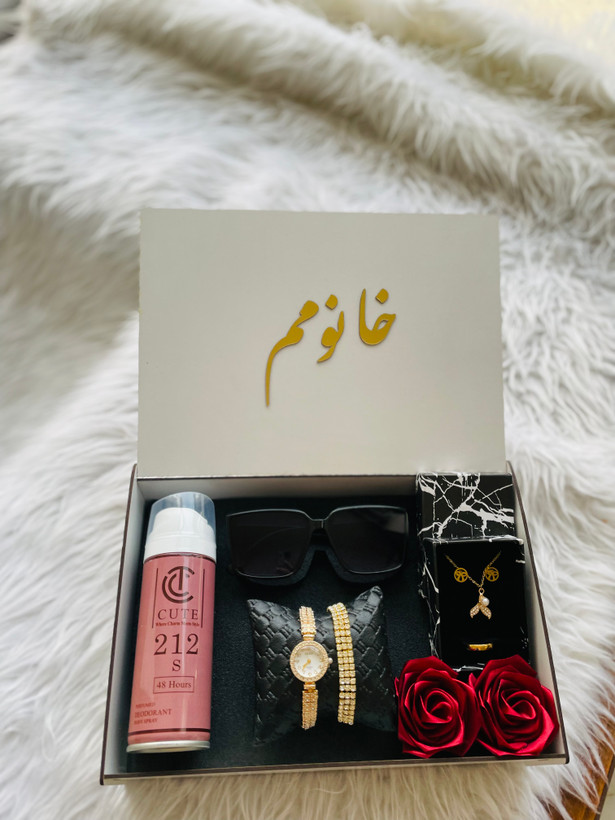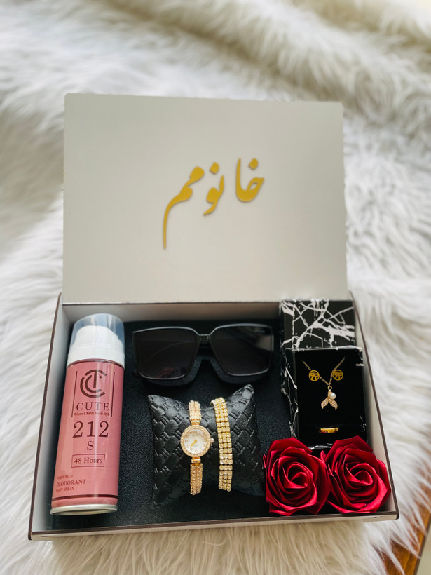 (ارسال رایگان) باکس هدیه زنانه و دخترانه لاکچری/ساعت و دستبند|اسپری |عینک|نیم ست||باکس چوبی کادو ولنتاین ۱۶