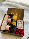 (ارسال رایگان) باکس هدیه زنانه و دخترانه لاکچری/فلاسک مسافرتی |ادکلن |پالت سایه |باکس چوبی کادو ولنتاین ۲۰