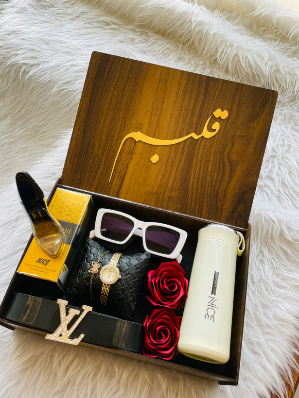 (ارسال رایگان) باکس هدیه زنانه و دخترانه لاکچری/ساعت |ادکلن |عینک|کمربند|بطری|باکس چوبی کادو ولنتاین ۲۱