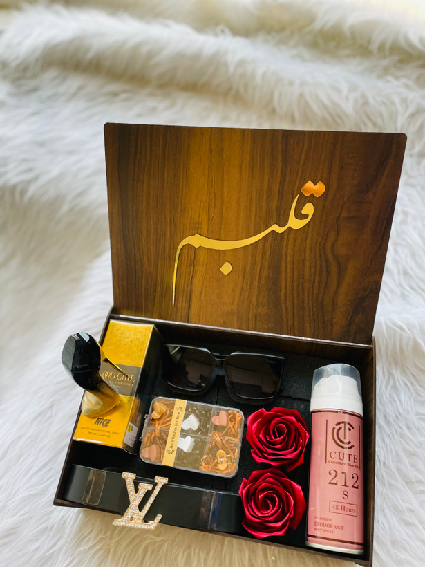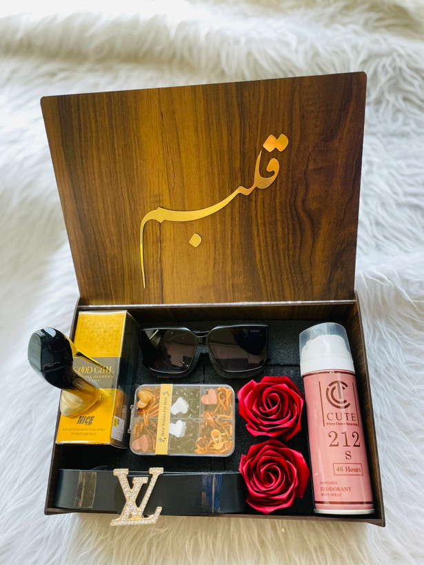 (ارسال رایگان) باکس هدیه زنانه و دخترانه لاکچری|ادکلن |عینک|کمربند|اسپری|پککش مو/باکس چوبی کادو ولنتاین ۲۲