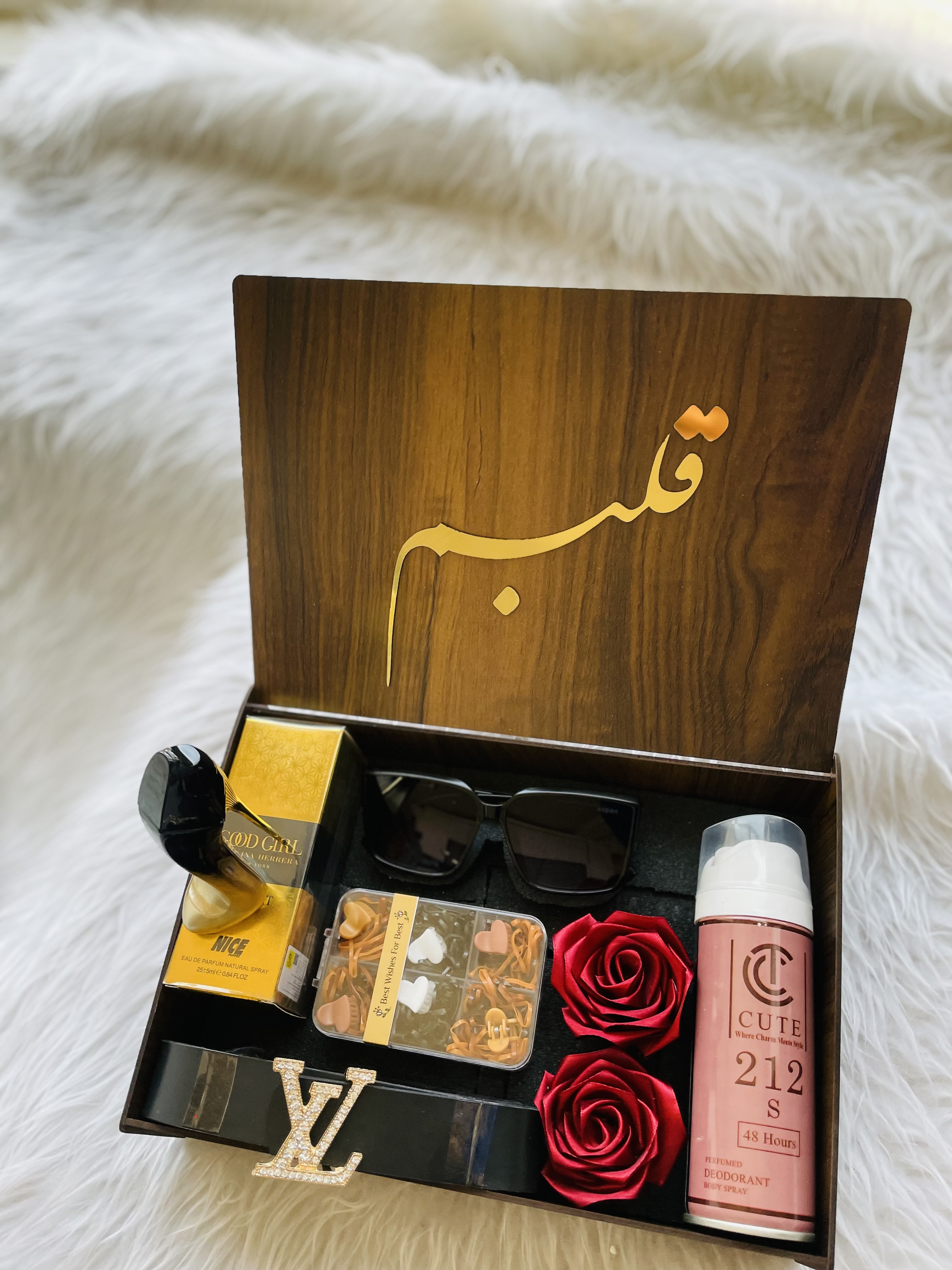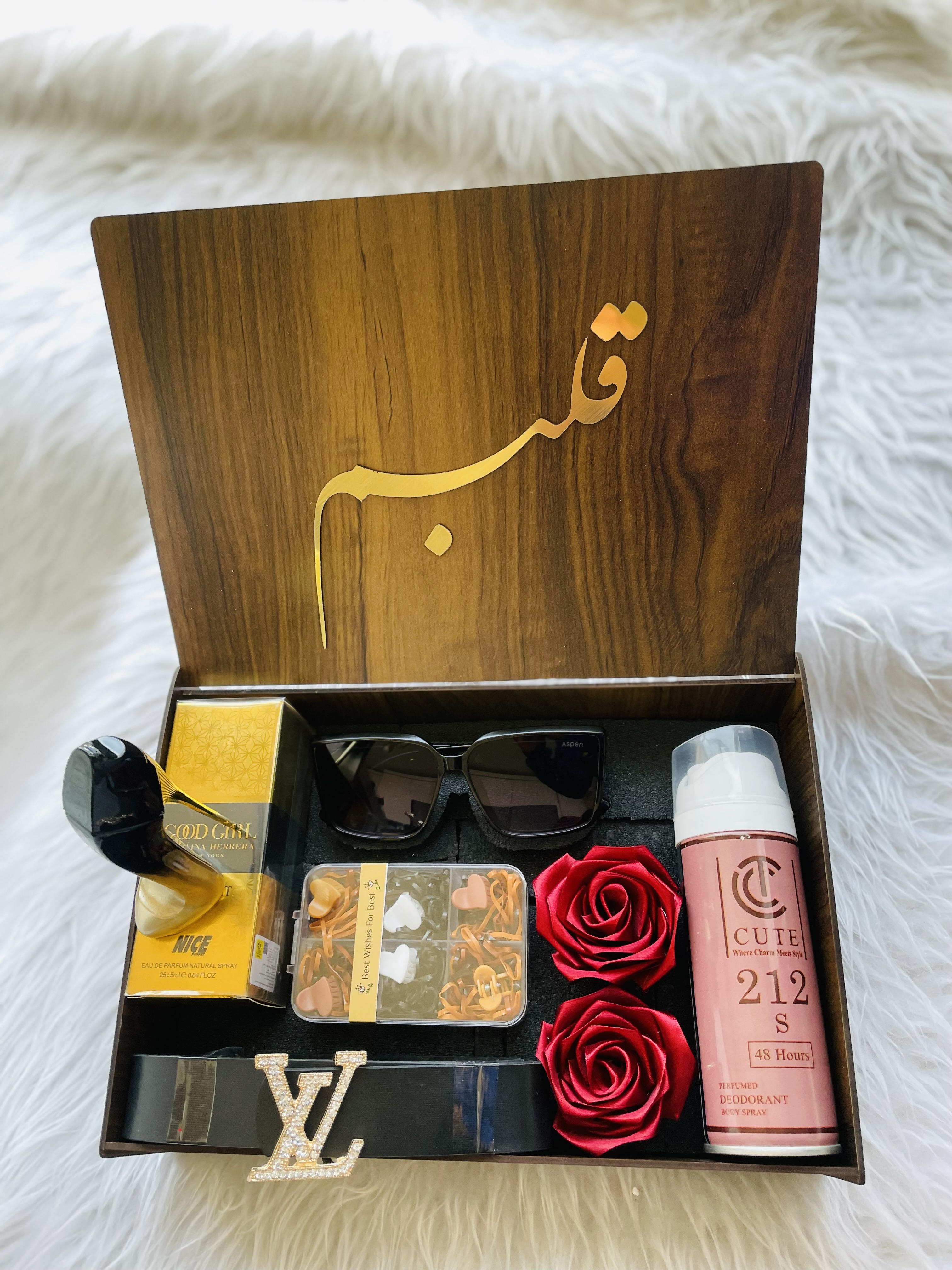 (ارسال رایگان) باکس هدیه زنانه و دخترانه لاکچری|ادکلن |عینک|کمربند|اسپری|پککش مو/باکس چوبی کادو ولنتاین ۲۲