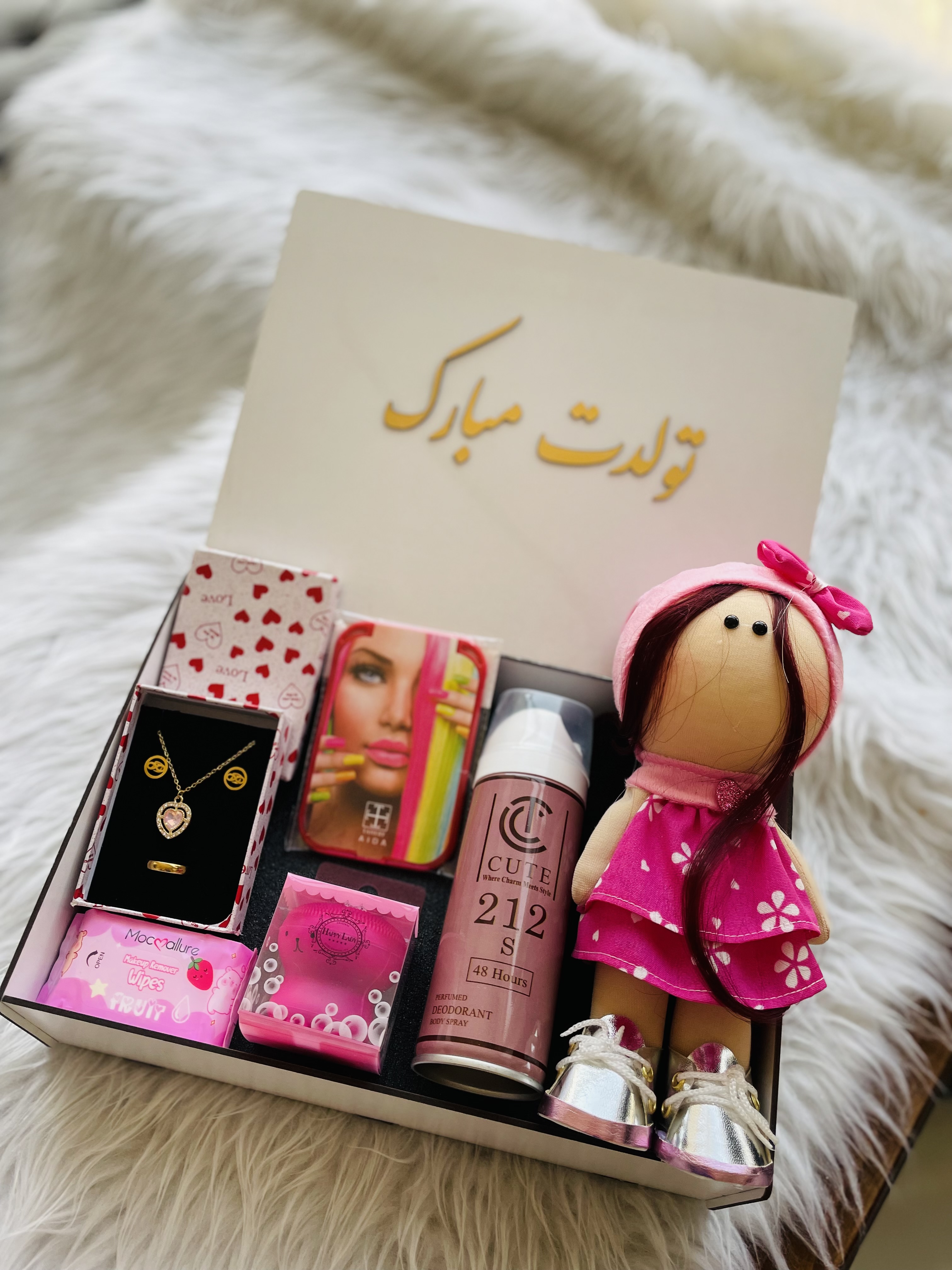 (ارسال رایگان) باکس هدیه زنانه و دخترانه لاکچری/عروسک/آینه|اسپری |نیم ست|فیس براش|باکس چوبی کادو ولنتاین ۲۹