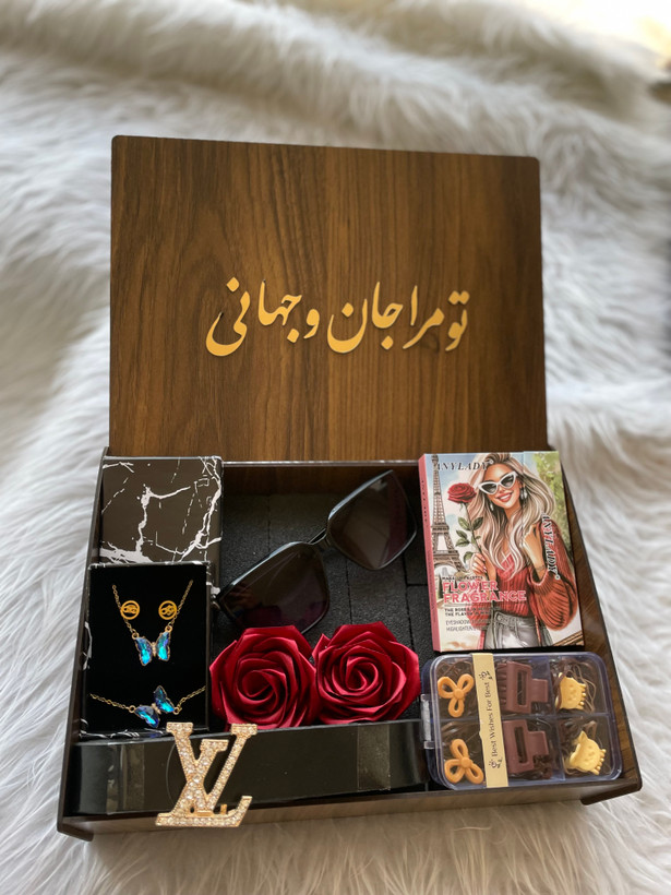 (ارسال رایگان) باکس هدیه زنانه و دخترانه لاکچری/سایه|عینک|نیم ست|کمربند|پک کش مو|باکس چوبی کادو ولنتاین ۳۱