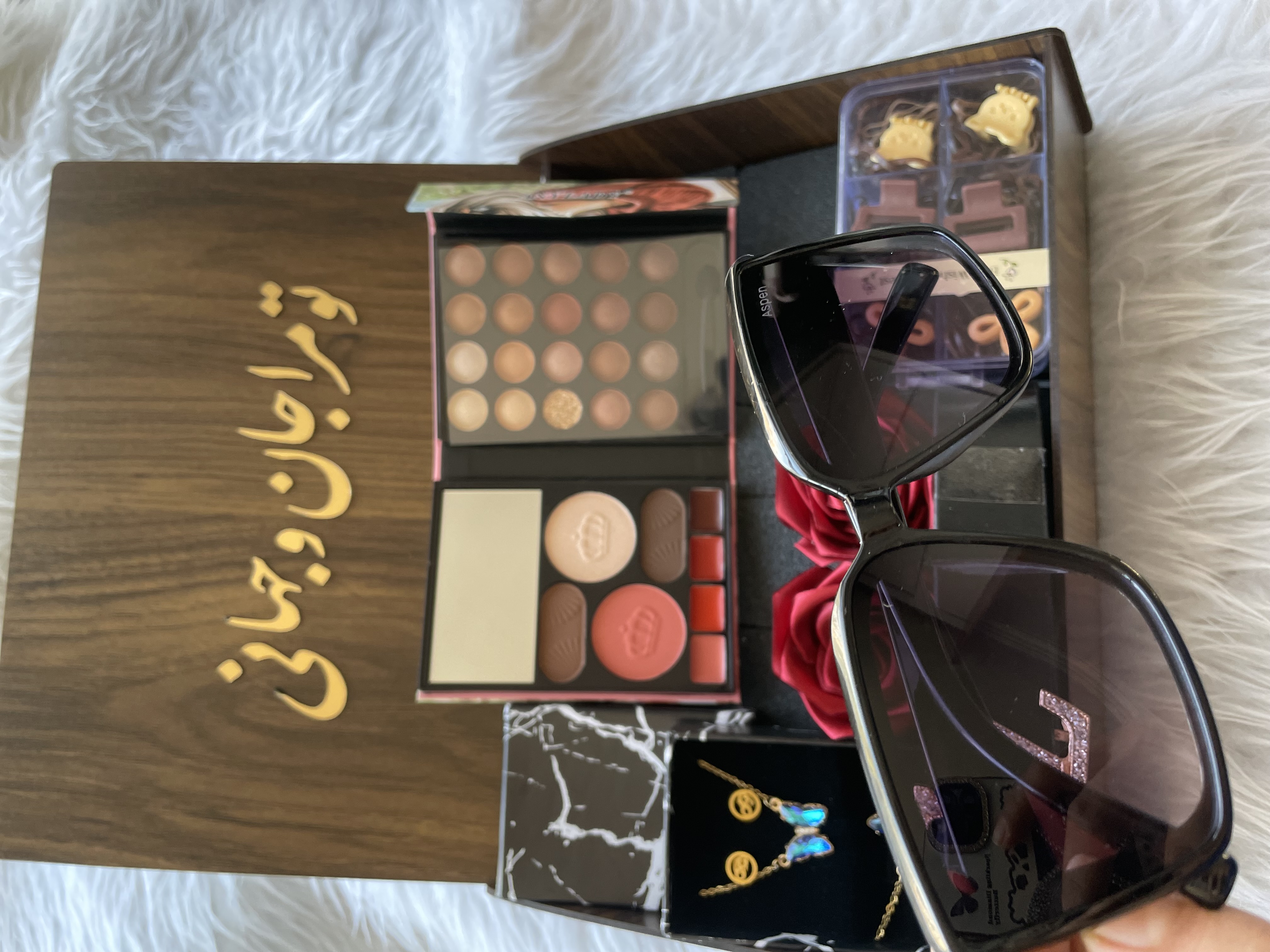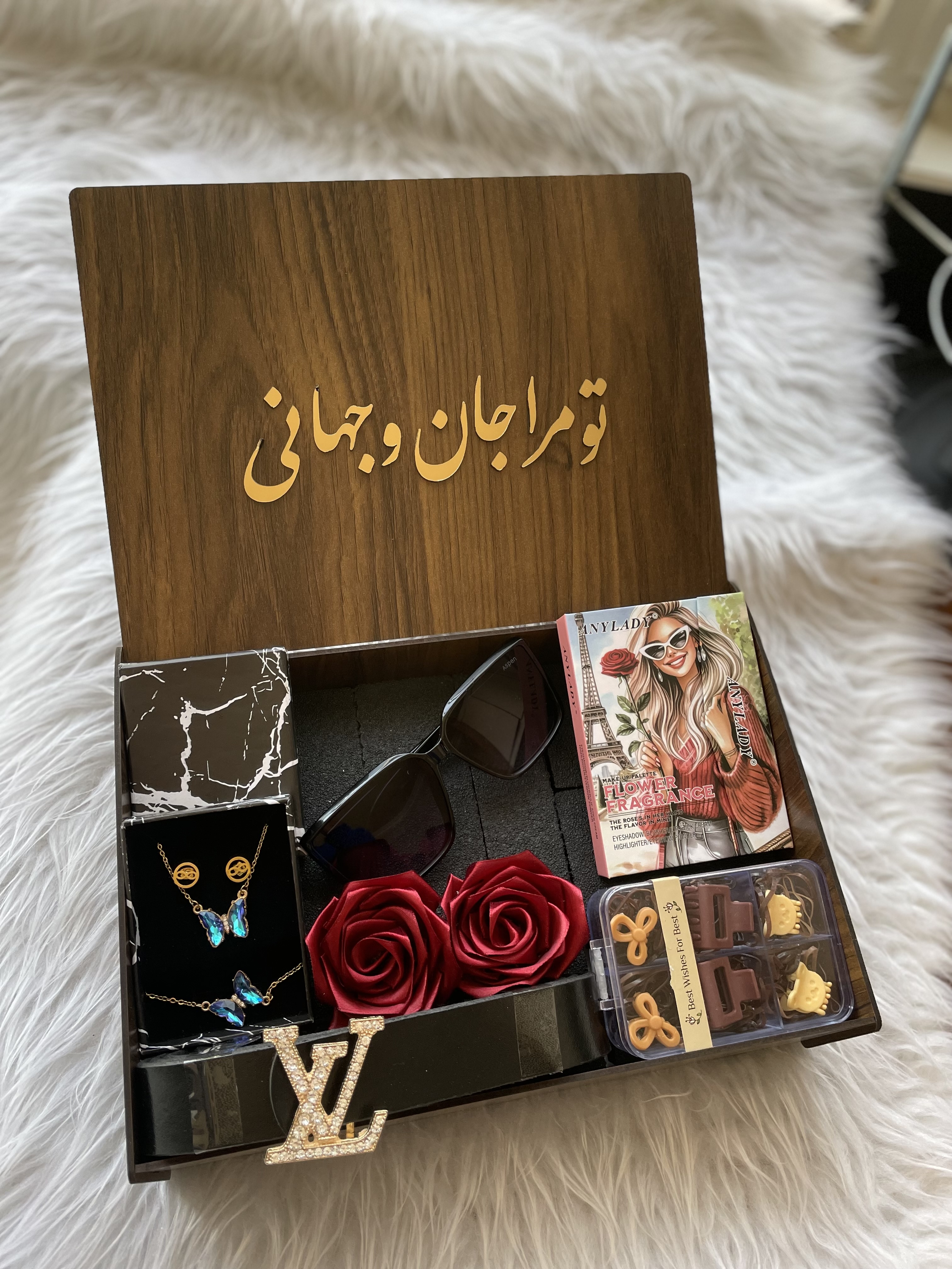 (ارسال رایگان) باکس هدیه زنانه و دخترانه لاکچری/سایه|عینک|نیم ست|کمربند|پک کش مو|باکس چوبی کادو ولنتاین ۳۱