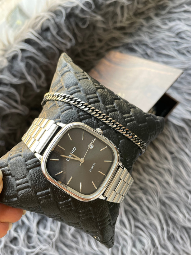 (ارسال رایگان) هدیه لاکچری مردانه کادو تولد ساعت کاسیو و ست کارتیر نقره ای جذاب ۱۰