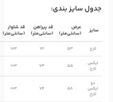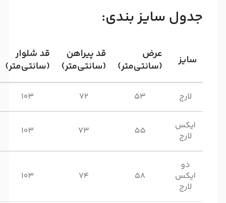 | سایز | عرض (سانتیمتر) | قد پیراهن (سانتیمتر) | قد شلوار (سانتیمتر) |