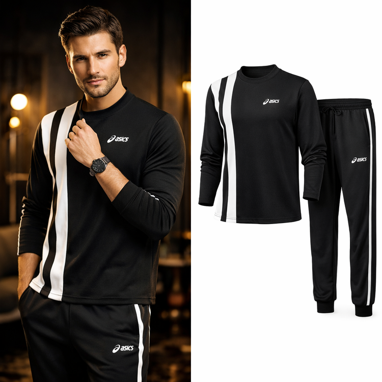 ست تیشرت آستین بلند و شلوار مردانه مدل Asics مشکی سفید سایز L | ست اسپرت بهاره با پارچه نرم و تنخور عالی