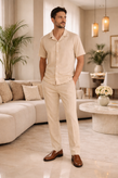 این ست مردانه با الهام از استایل مراکشی، ترکیبی از سادگی، اصالت و طراحی مدرن است. رنگ کرم گرم آن بهراحتی با انواع کفش و اکسسوری ست میشود و ظاهری شیک و مرتب ایجاد میکند. پیراهن آستین کوتاه دکمهدار با یقه برگردان کلاسیک در کنار شلوار راحت با کمر کشی، استایلی هماهنگ و خوشفرم ساخته که هم برای استفاده روزمره مناسب است و هم برای دورهمیها و مهمانیهای نیمهرسمی. این ست انتخابی کاربردی برای آقایانی است که به ظاهر آراسته و در عین حال راحتی اهمیت میدهند.