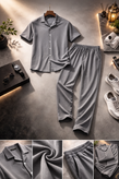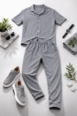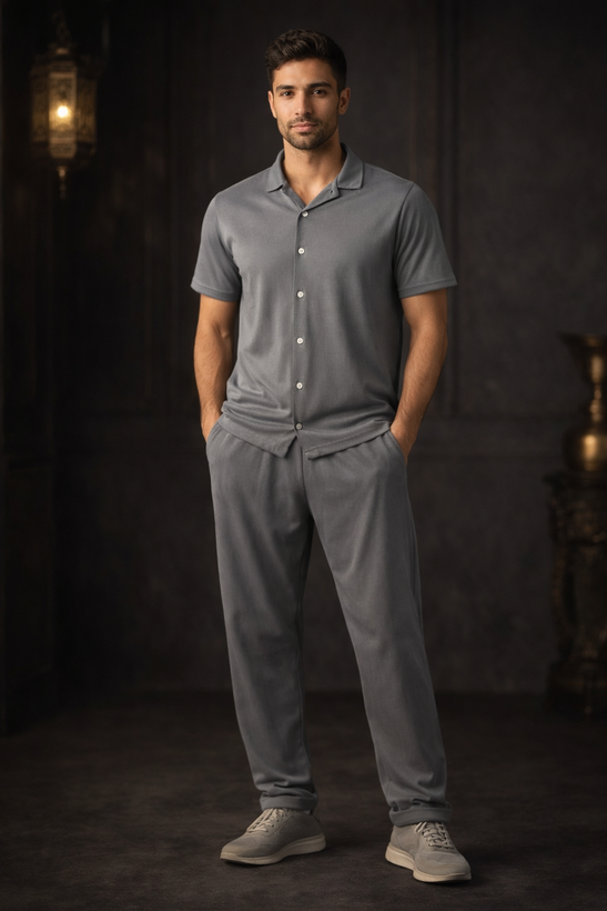 ست لباس مردانه مراکشی طوسی سایز xxl| تیشرت دکمهدار + شلوار اسلش | خنک، شیک و مینیمال