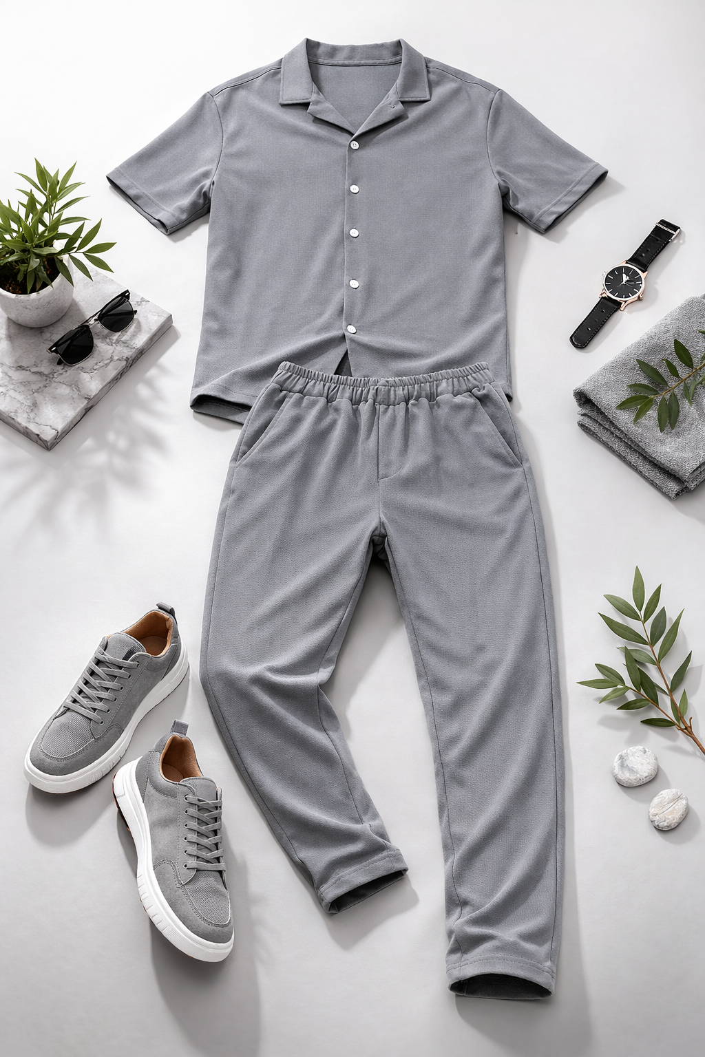 ست لباس مردانه مراکشی طوسی سایز xxl| تیشرت دکمهدار + شلوار اسلش | خنک، شیک و مینیمال