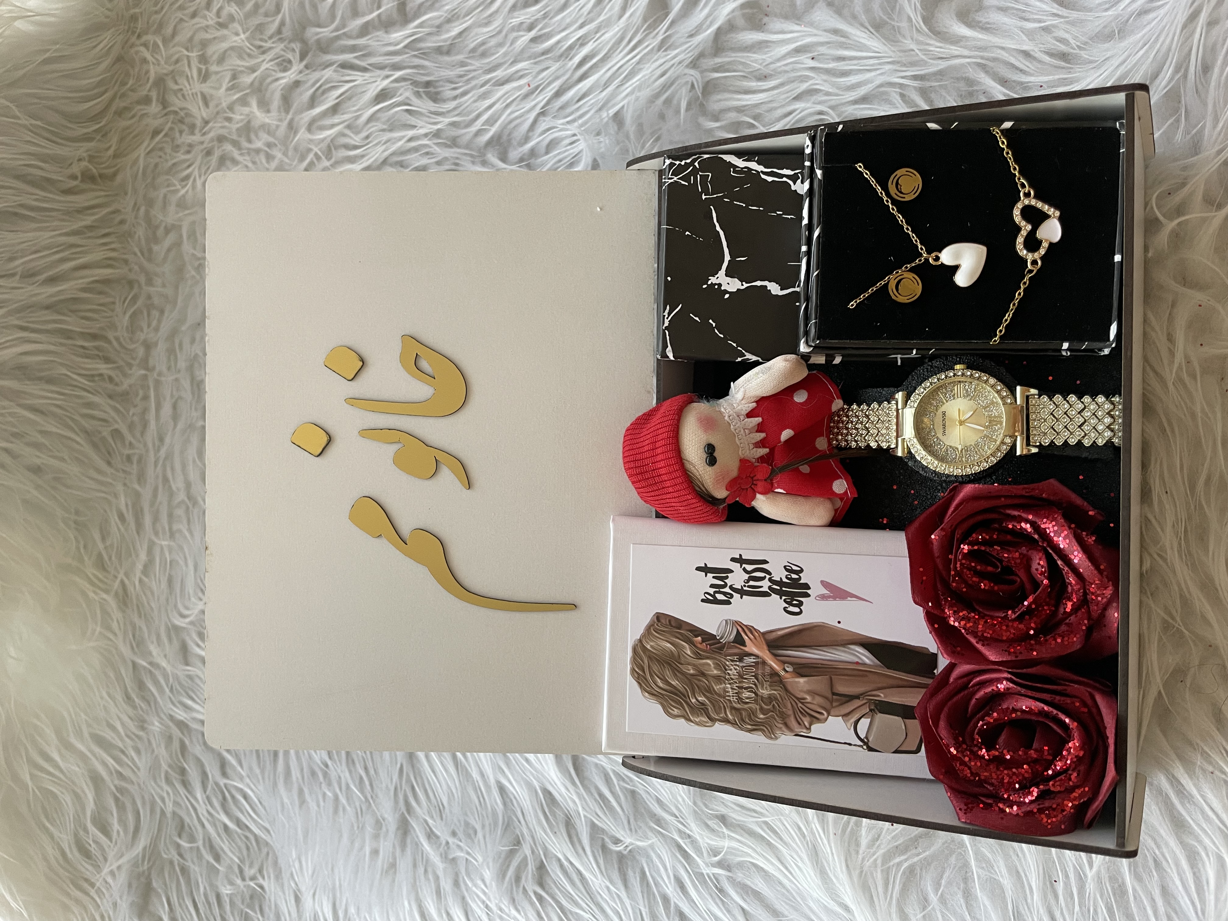 باکس هدیه ویژه روز زن | ست اکسسوری شیک با ساعت، گردنبند، عروسک و رز ربانی| مناسب هدیه مناسبتی + ارسال رایگان