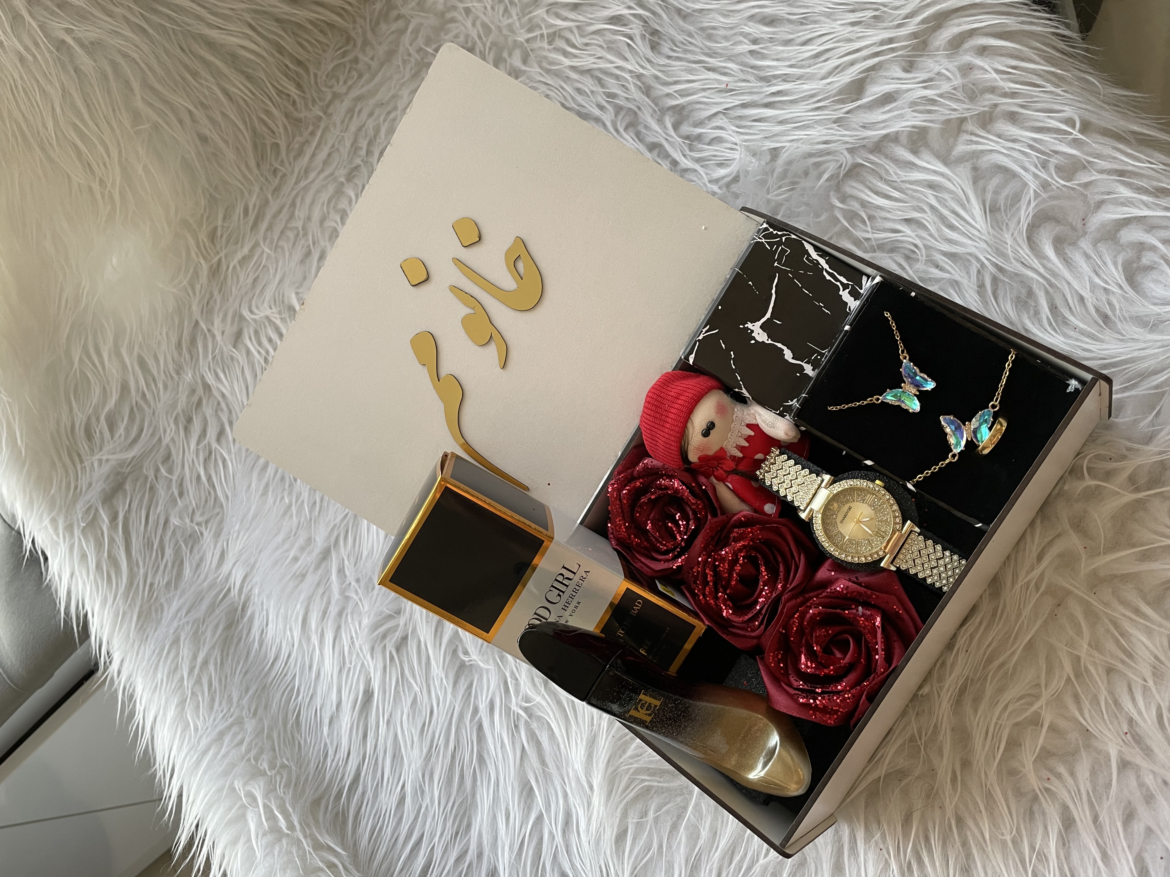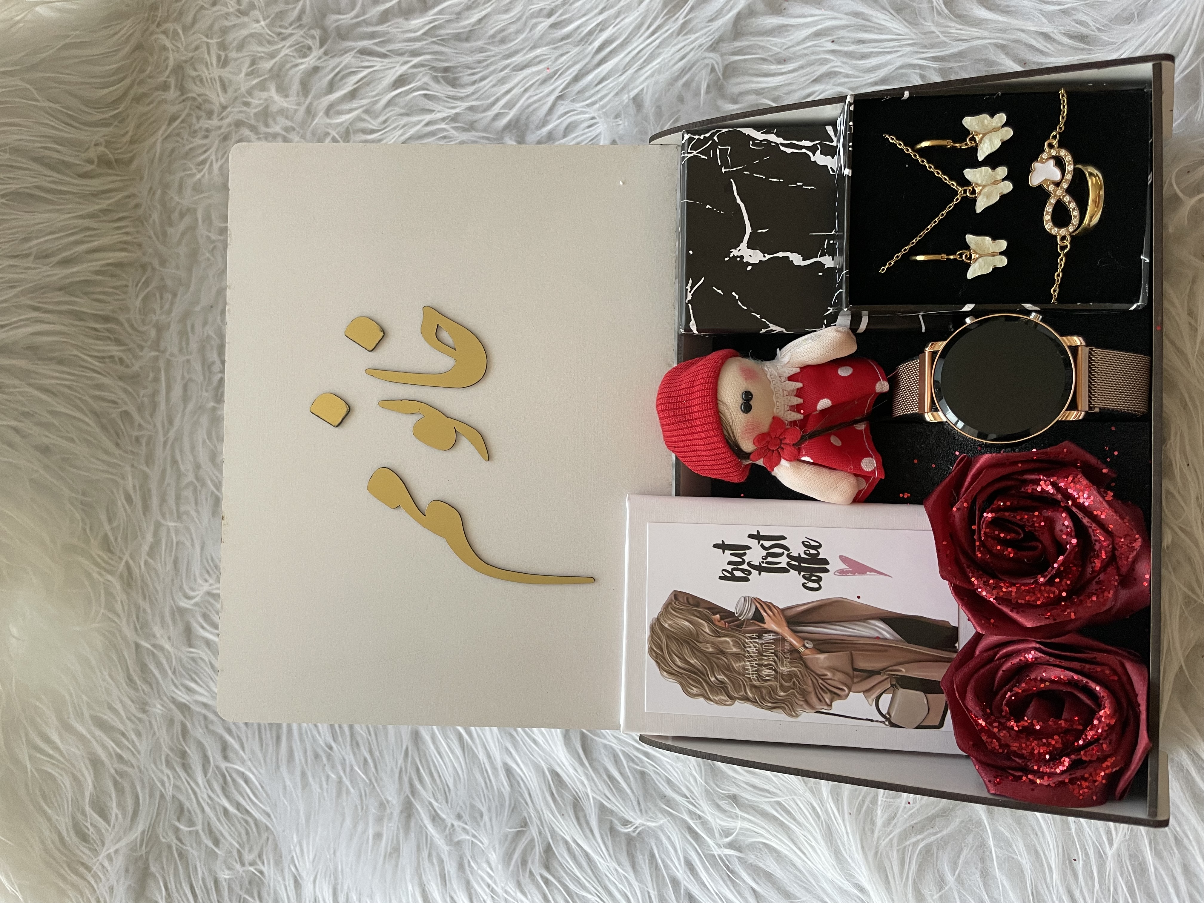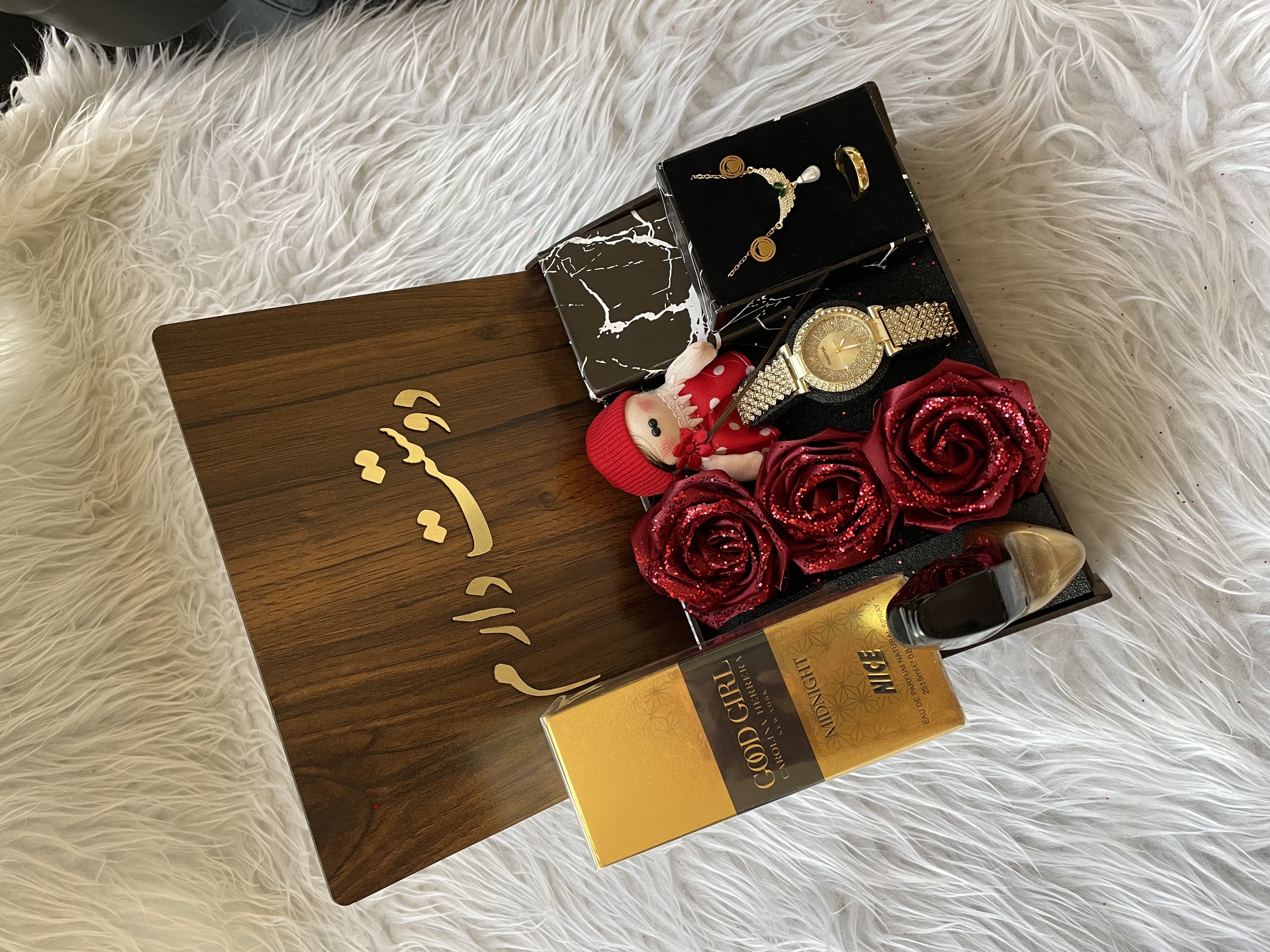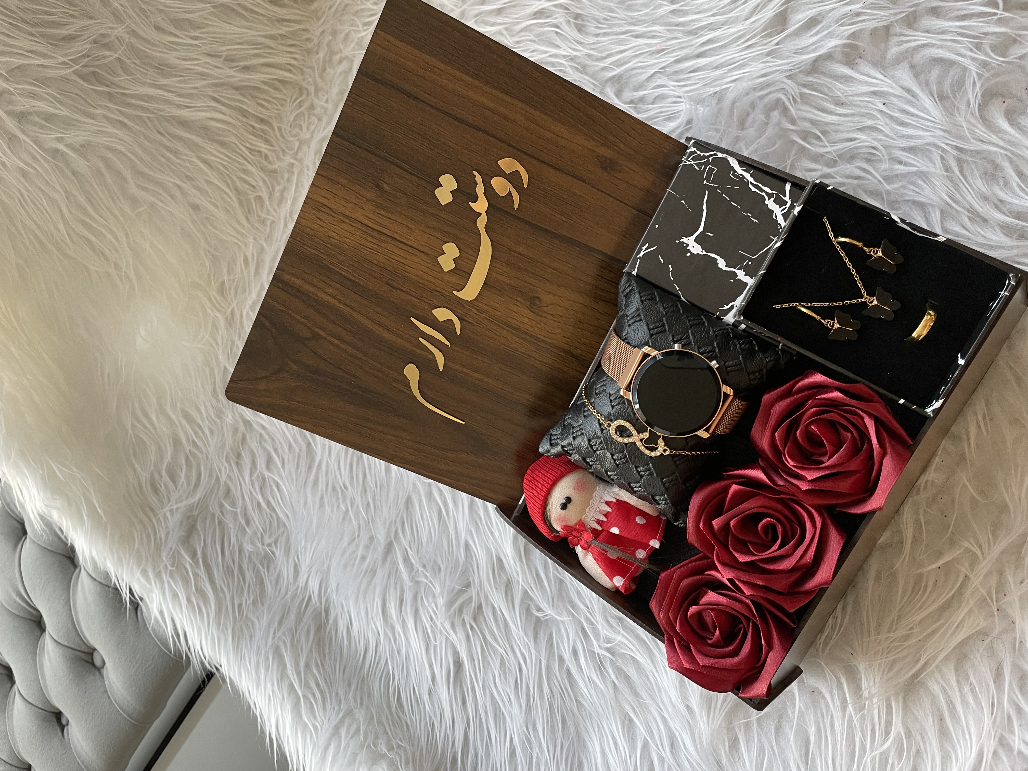 (ارسال رایگان) باکس هدیه زنانه و دخترانه شیک و خاص/ساعت/ادکلن/باکس چوبی با متن انتخابی