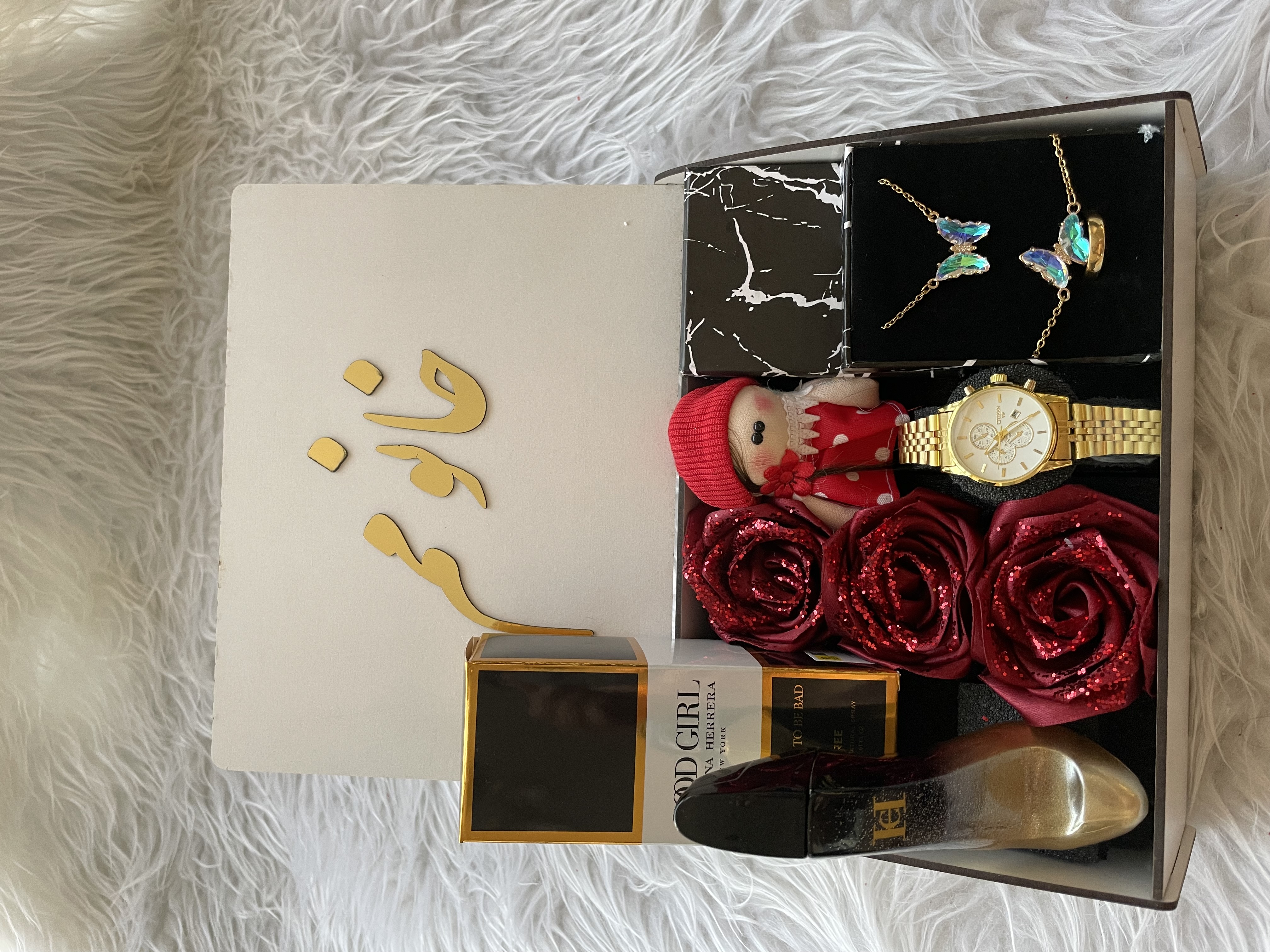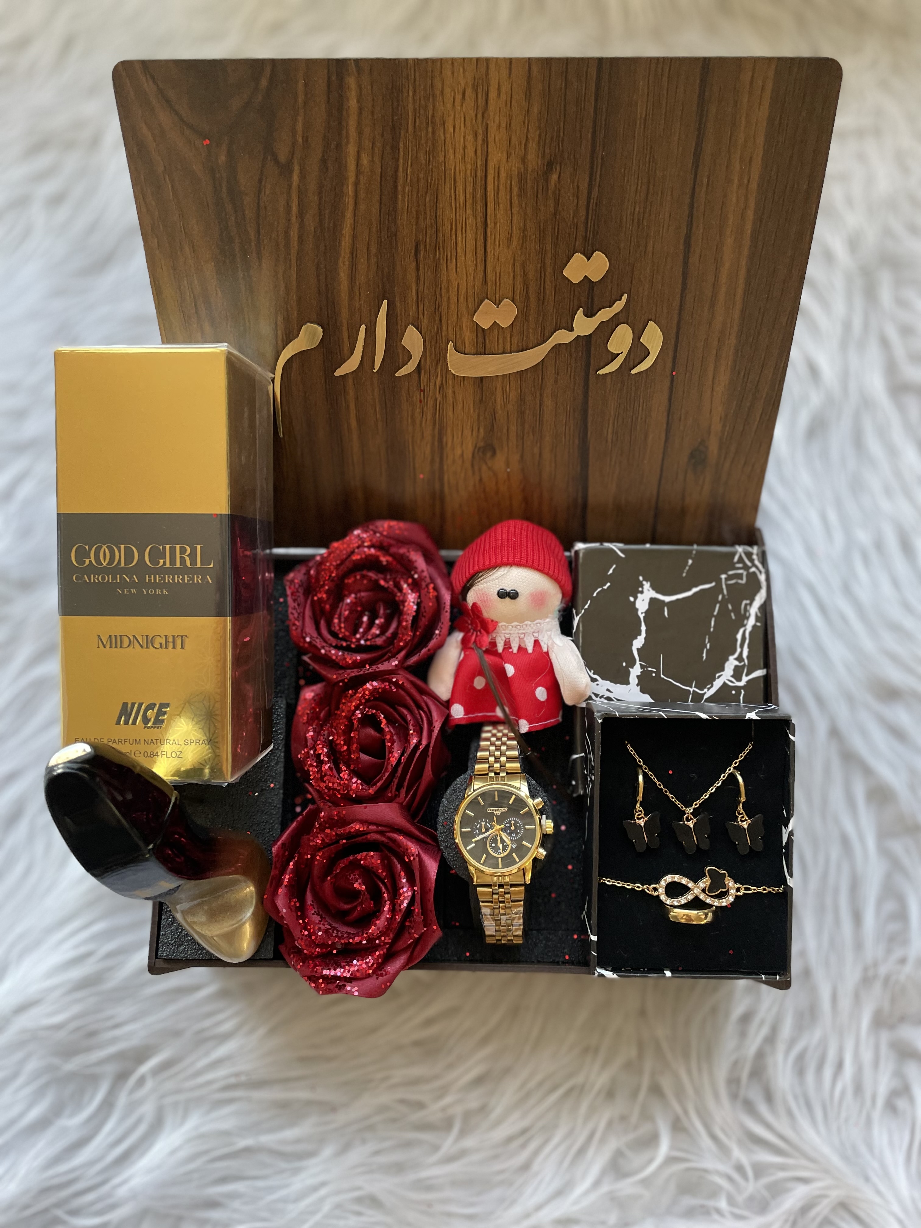 (ارسال رایگان) باکس هدیه زنانه و دخترانه شیک و خاص/ساعت/ادکلن/نیم ست/باکس چوبی