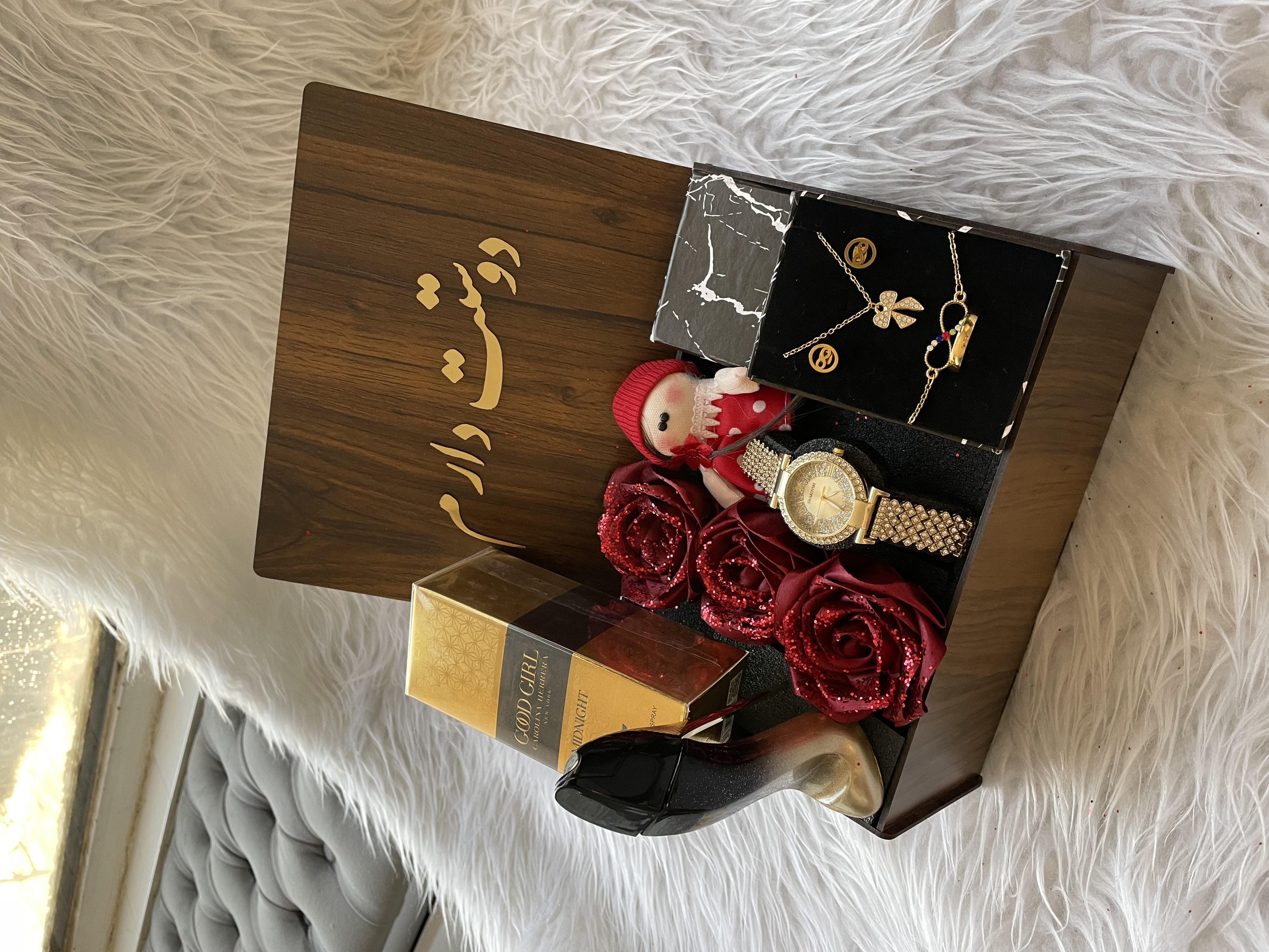 (ارسال رایگان)باکس هدیه چوبی زنانه و دخترانه شیک و خاص/کادو/تولد/ساعت/ادکلن ۸۵